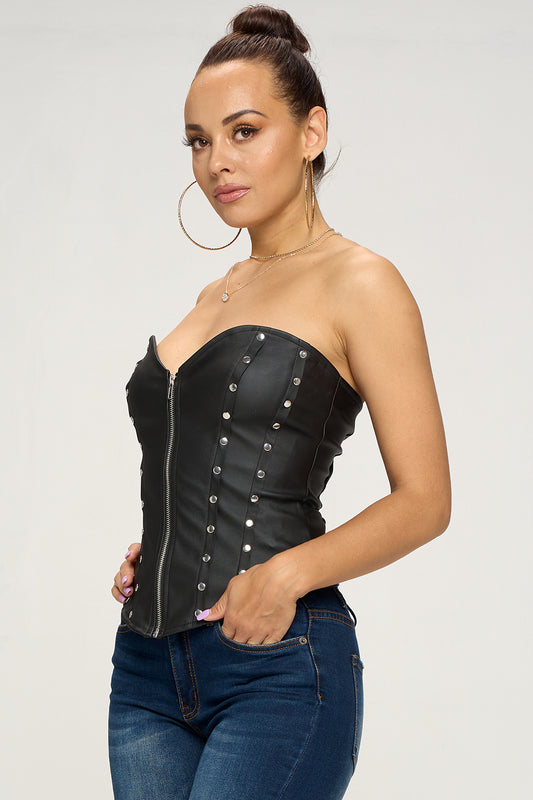FAUX LEATHER STUD DETAILED ZIP FRONT CORSET TOP