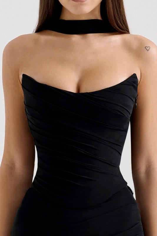Sexy Plunging Halter Neck Ruched Mesh Maxi Dress