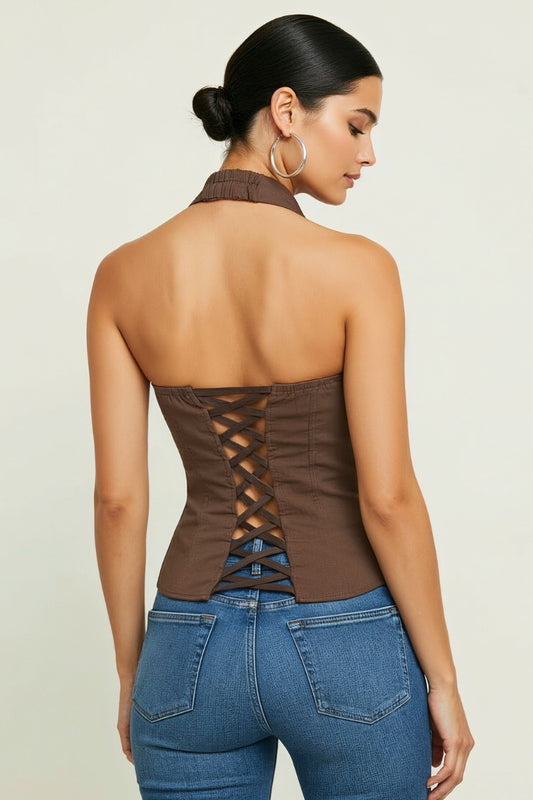 LACE UP COLLAR HALTER TANK TOP