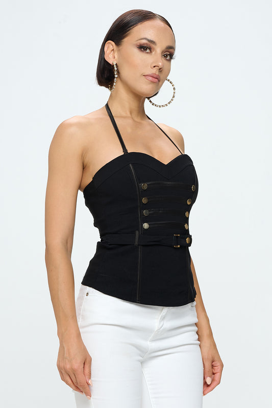 BUTTON TRIM BELTED HALTER NECK CORSET TOP