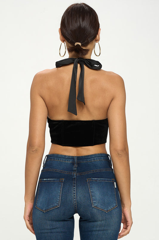 SATIN HALTER NECK WRAP VELVET CROP TOP