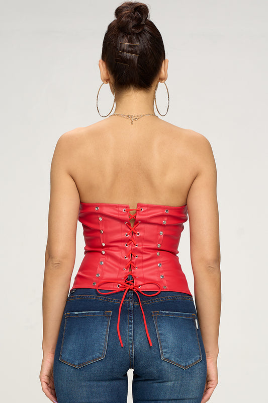 FAUX LEATHER STUD DETAILED ZIP FRONT CORSET TOP