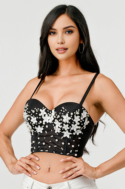 PEARL EMBELLISHED PETAL TRIM BUSTIER CROP TOP