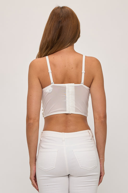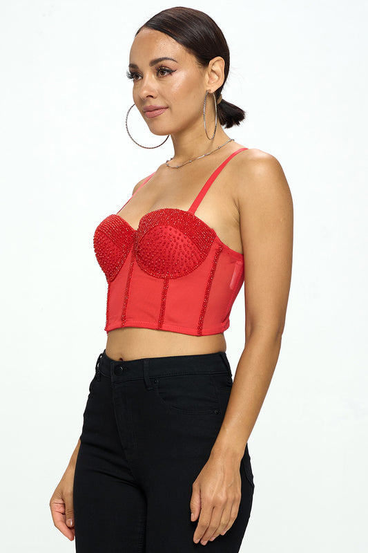 JEWEL BEAD EMBELLISHED MESH BONE CORSET CROP TOP