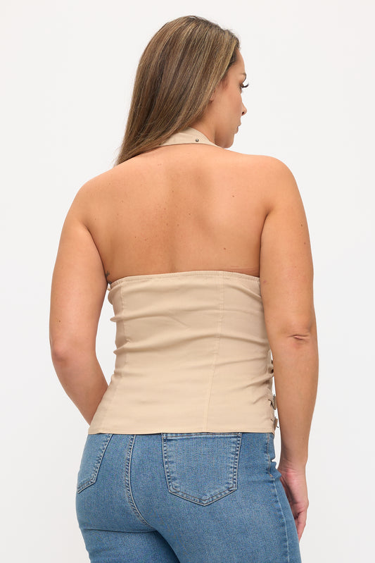 BUCKLE DETAIL ZIPPER FRONT COLLAR HALTER TANK TOP