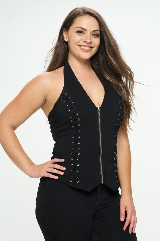 LACE-UP DETAIL ZIP UP SLEEVELESS TOP -PLUS