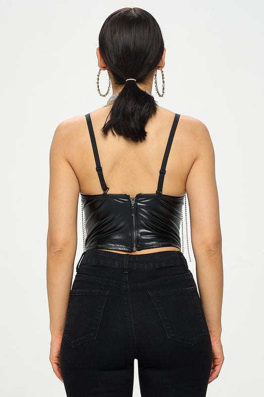 RHINESTONE FRINGE PU CORSET CROP TOP_ D7218