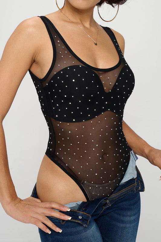 RHINESTONE EMBELLISHED SHEER MESH BODYSUIT
