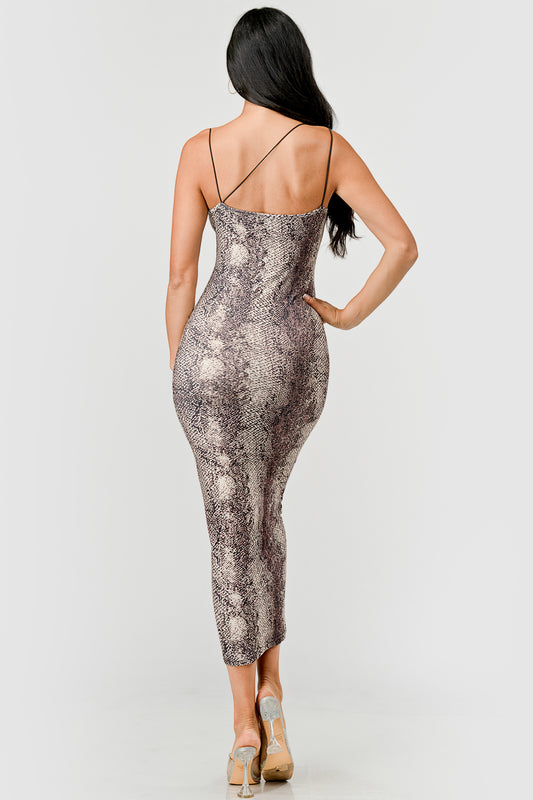 SNAKE PRINT V-NECK STRAPPY BODYCON MAXI DRESS