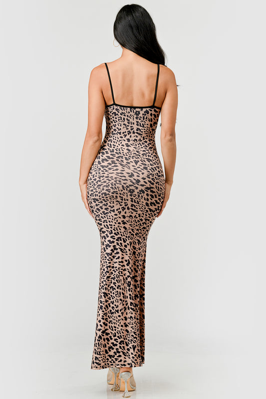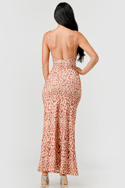 LEOPARD PRINT COWL NECK BACKLESS BODYCON MAXI DRESS