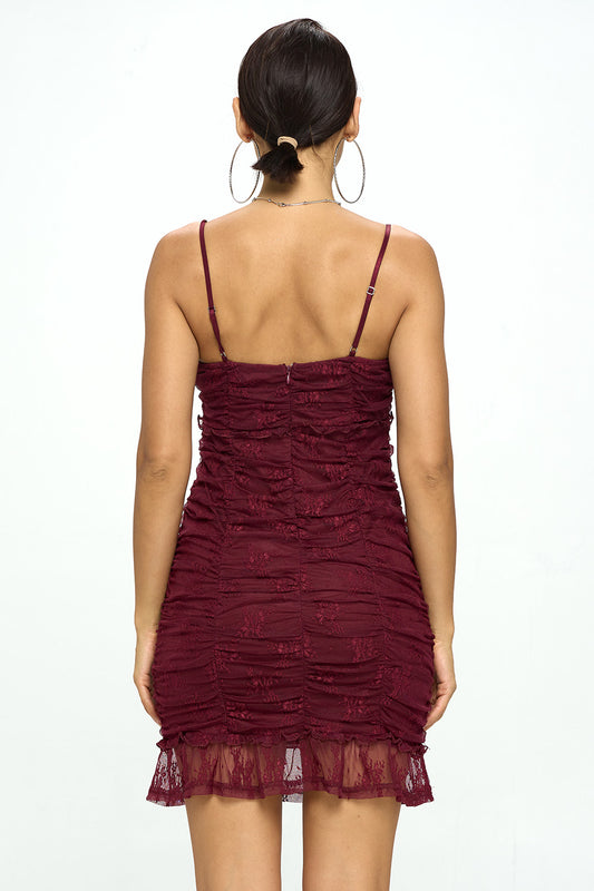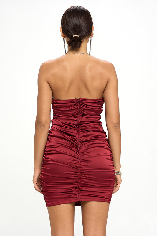PLEATED DEEP V-NECK CUTOUT SATIN MINI DRESS
