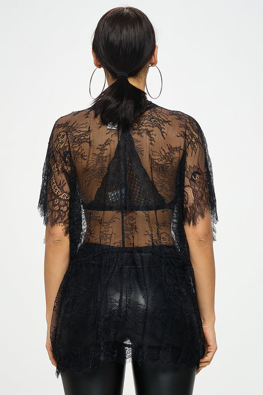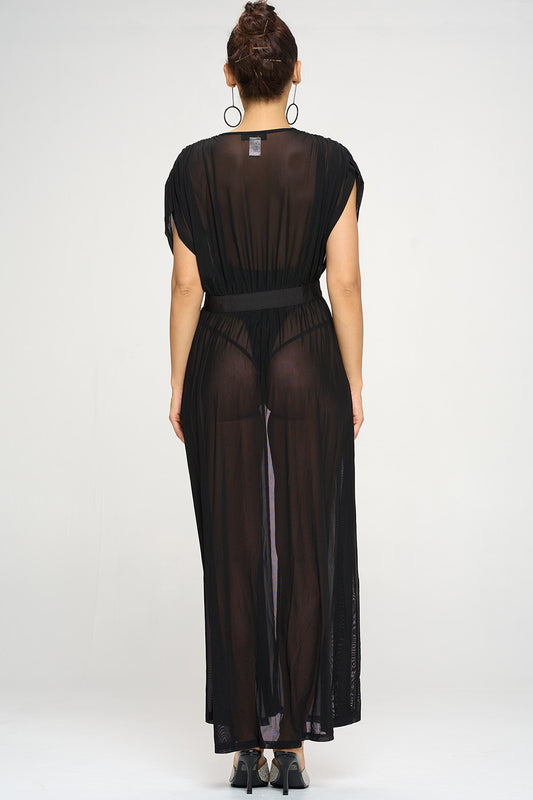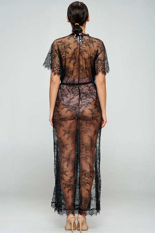 SHEER DRAWSTRING LACE KIMONO COVER UP GOWN
