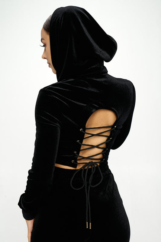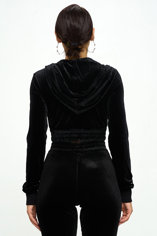 VELVET ZIP UP LACE BACK CROP HOODED JACKET