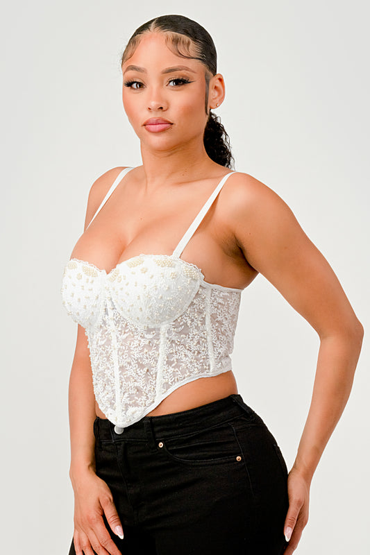 FLORAL LACE BEADED CORSET BUSTIER CROP TOP
