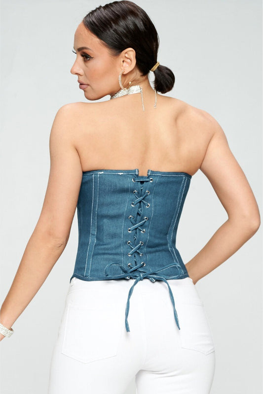 DENIM RIGID ZIP UP FRONT LACE UP CORSET