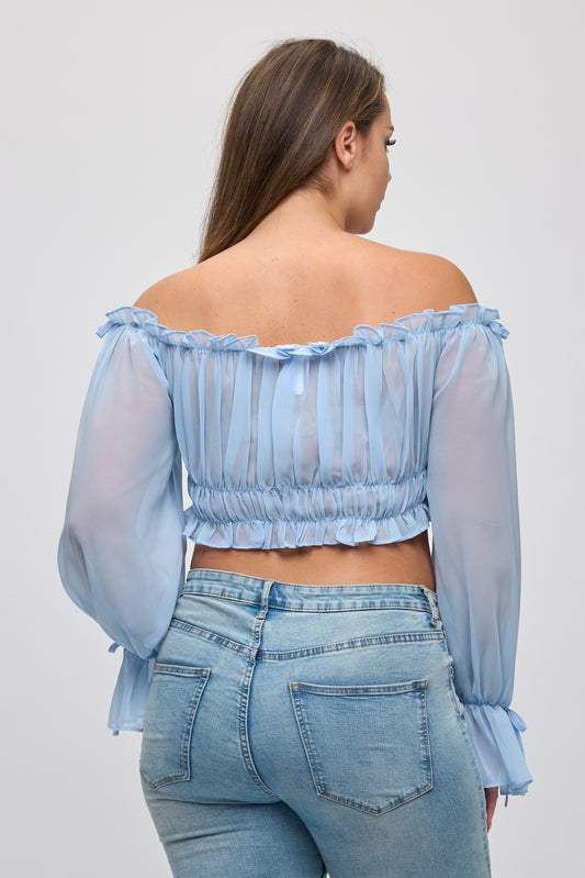 OFF SHOULDER RUFFLE TRIM KNOT SLEEVE CROP TOP PLUS