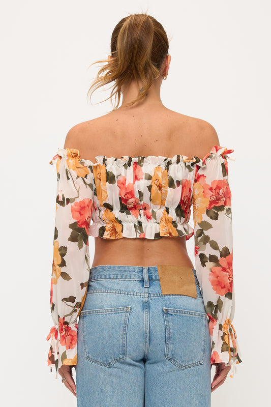 Sheer Ruffled Mesh Off-Shoulder Crop Top