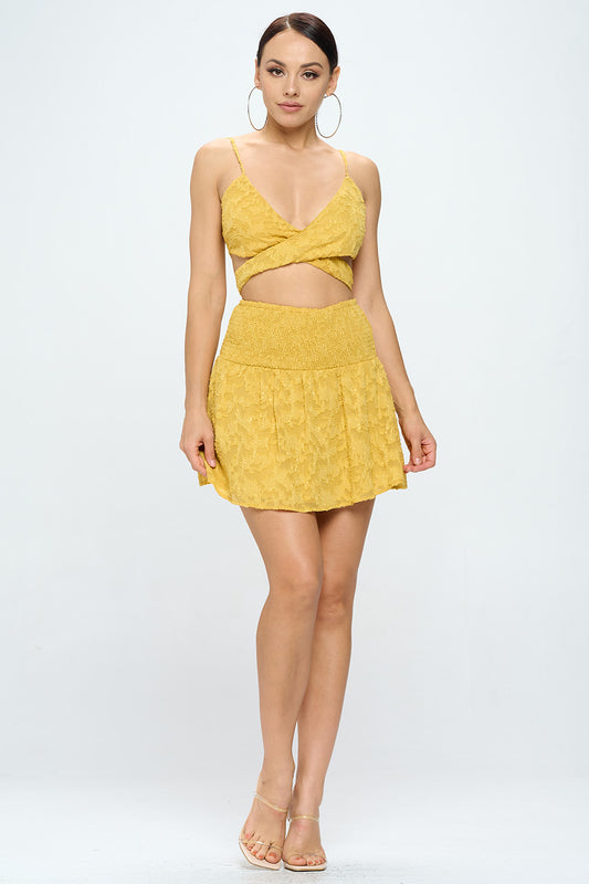 SMOCKED HIGH RISE FLOUNCE MINI SKIRT