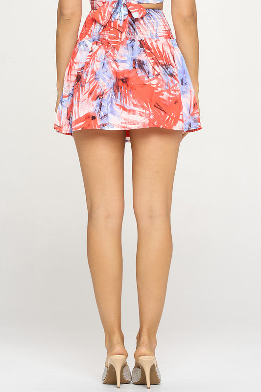 TROPICAL PRINT SMOCKED FLOUNCE SKIRT