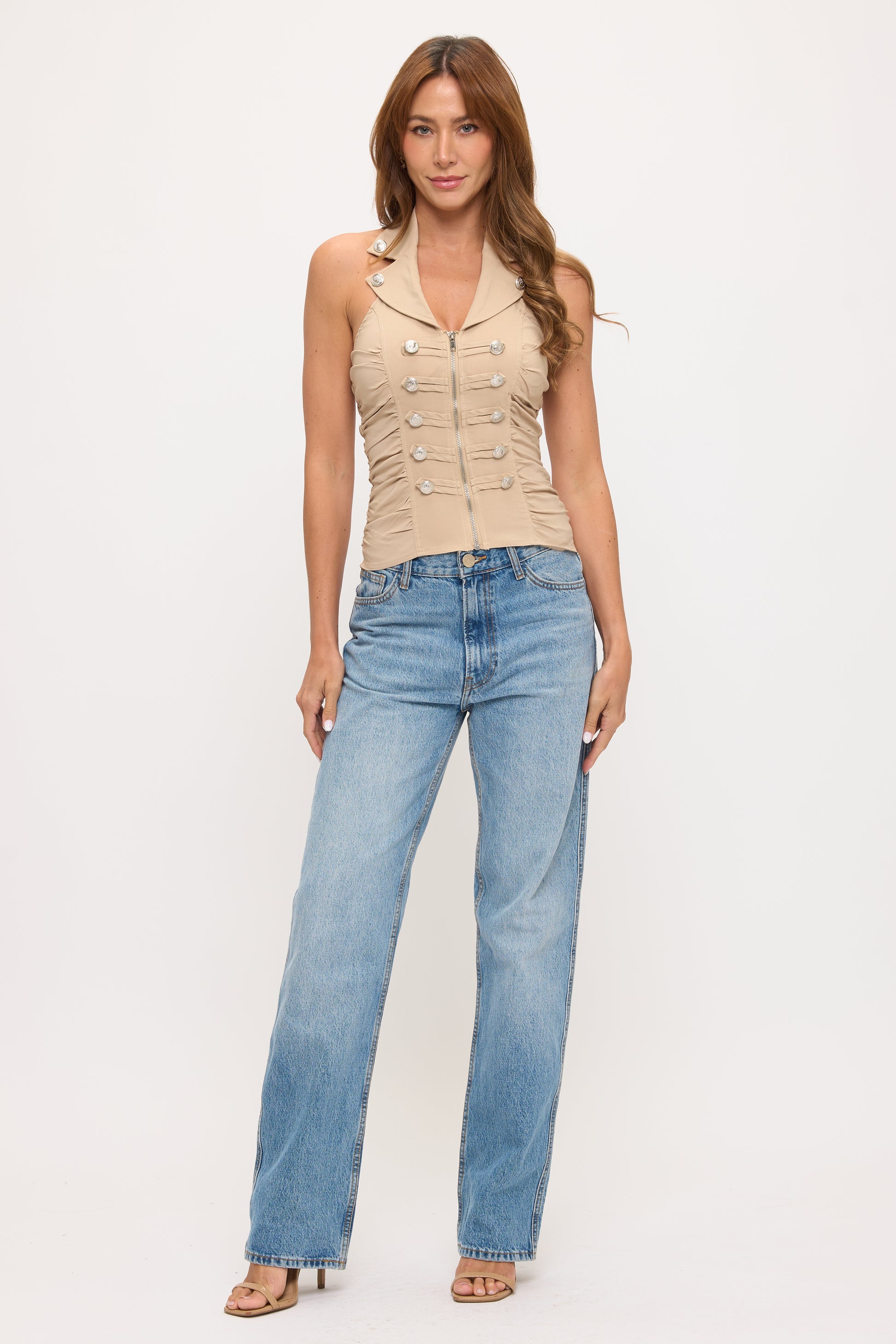 BUTTON DETAILED ZIP UP CLOSURE HALTER TANK TOP_D6618