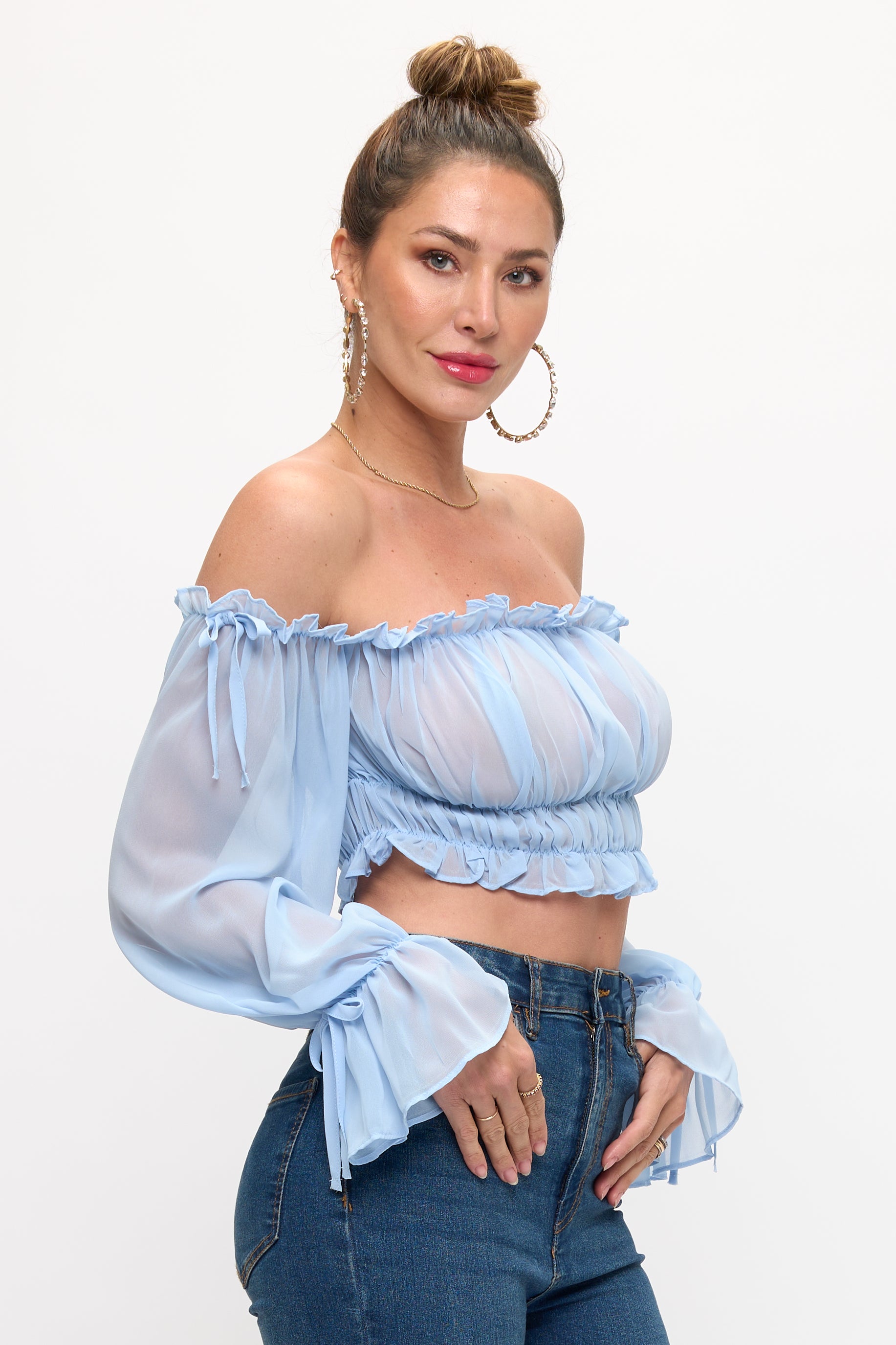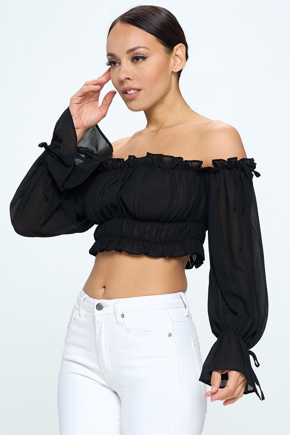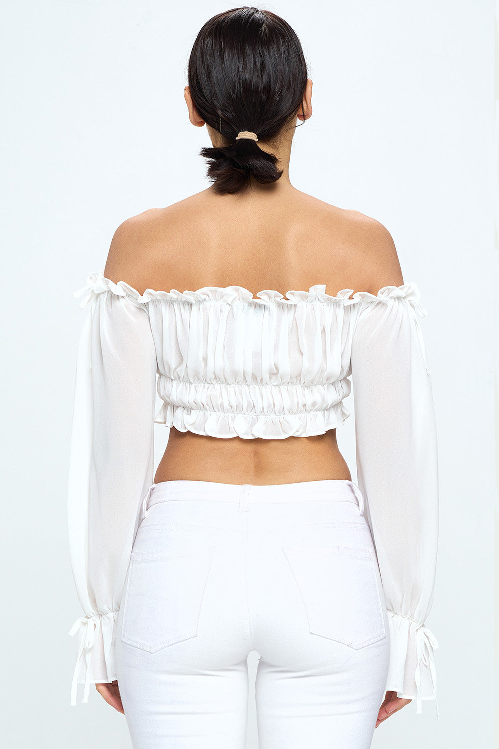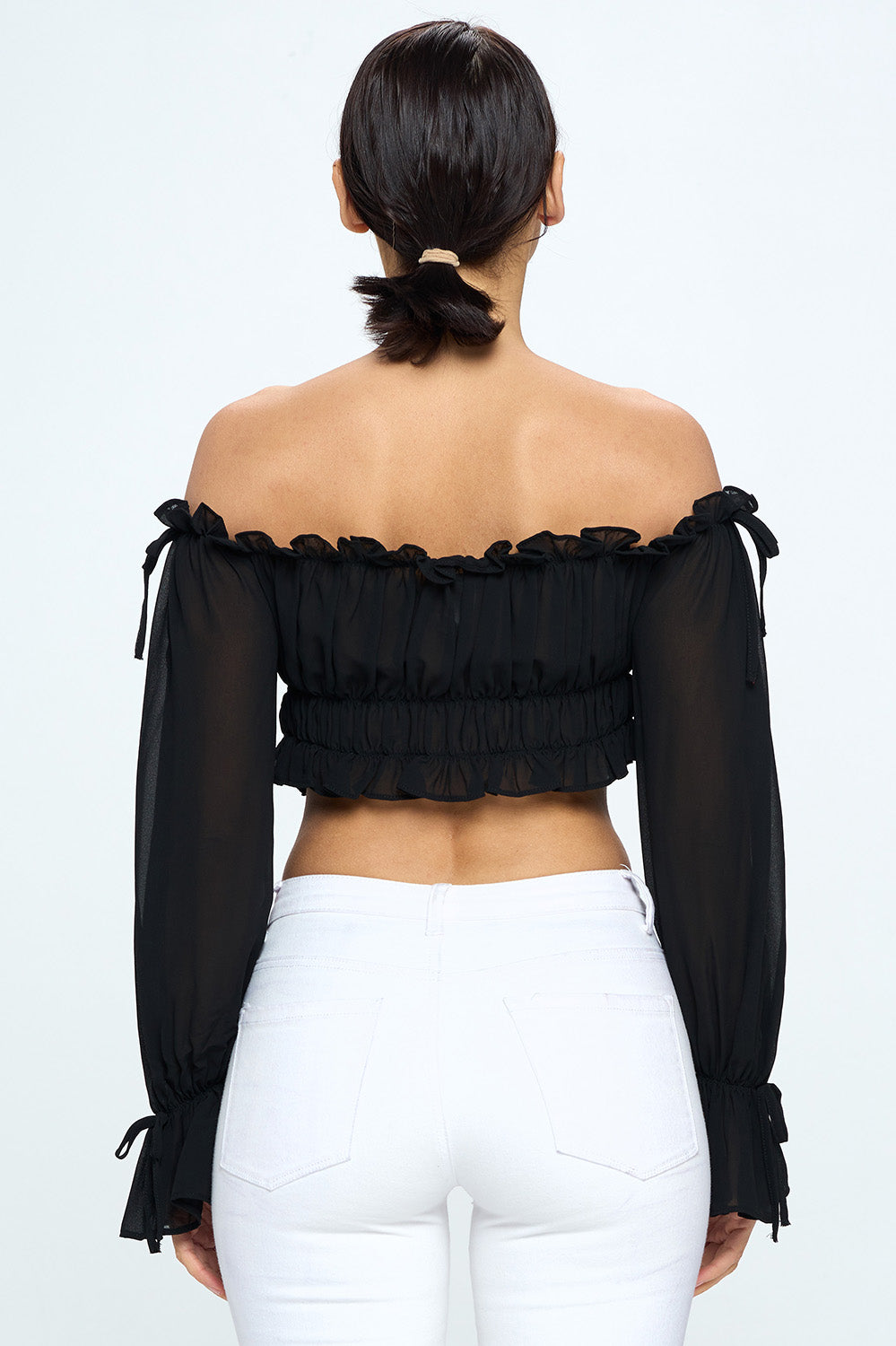 OFF SHOULDER RUFFLE TRIM KNOT SLEEVE CROP TOP