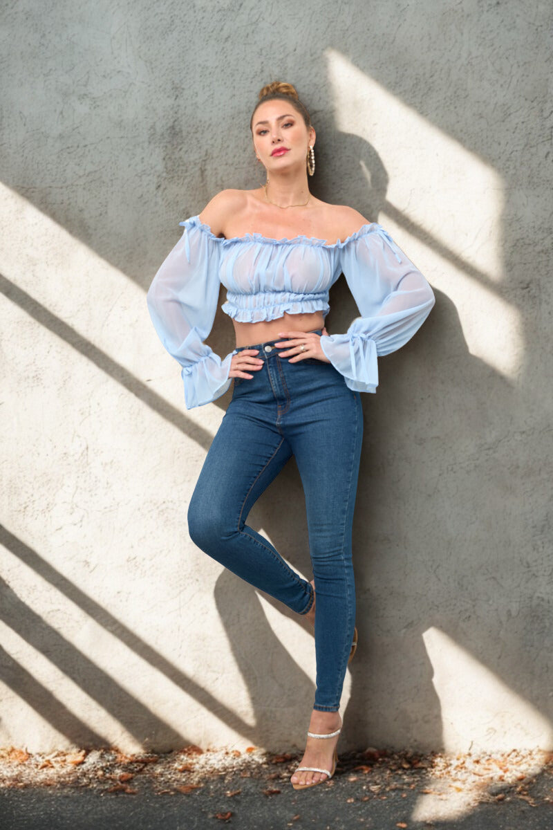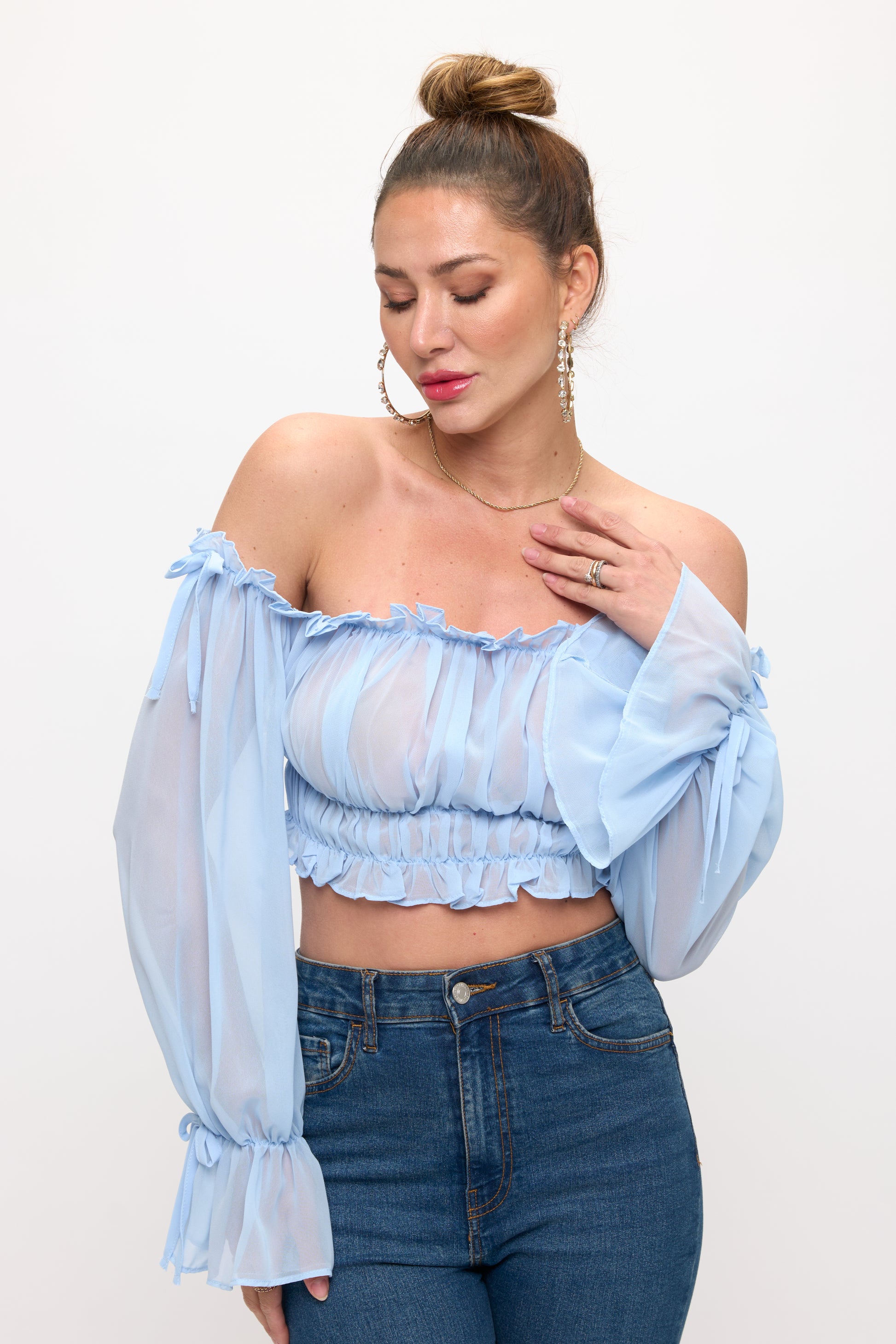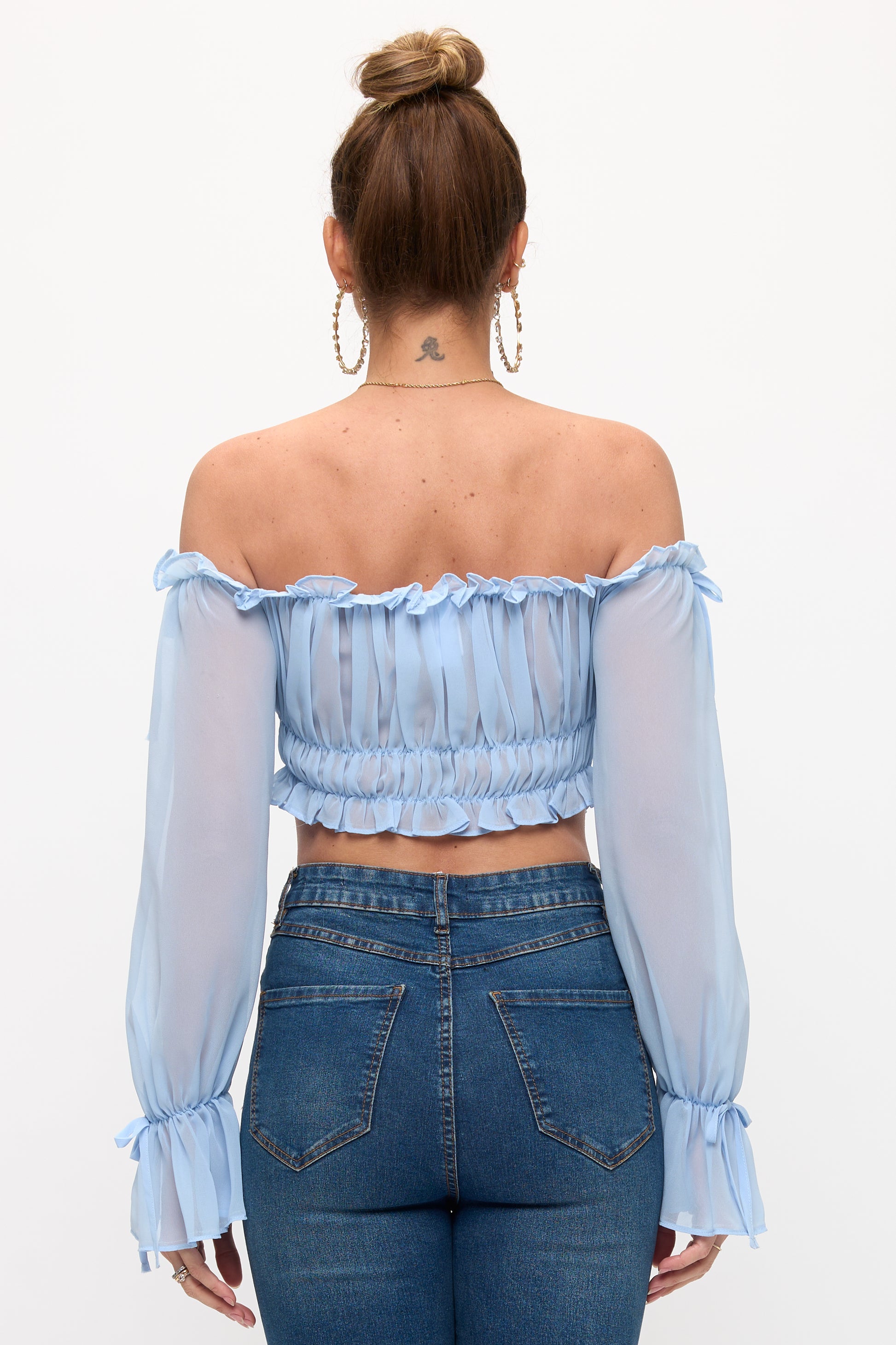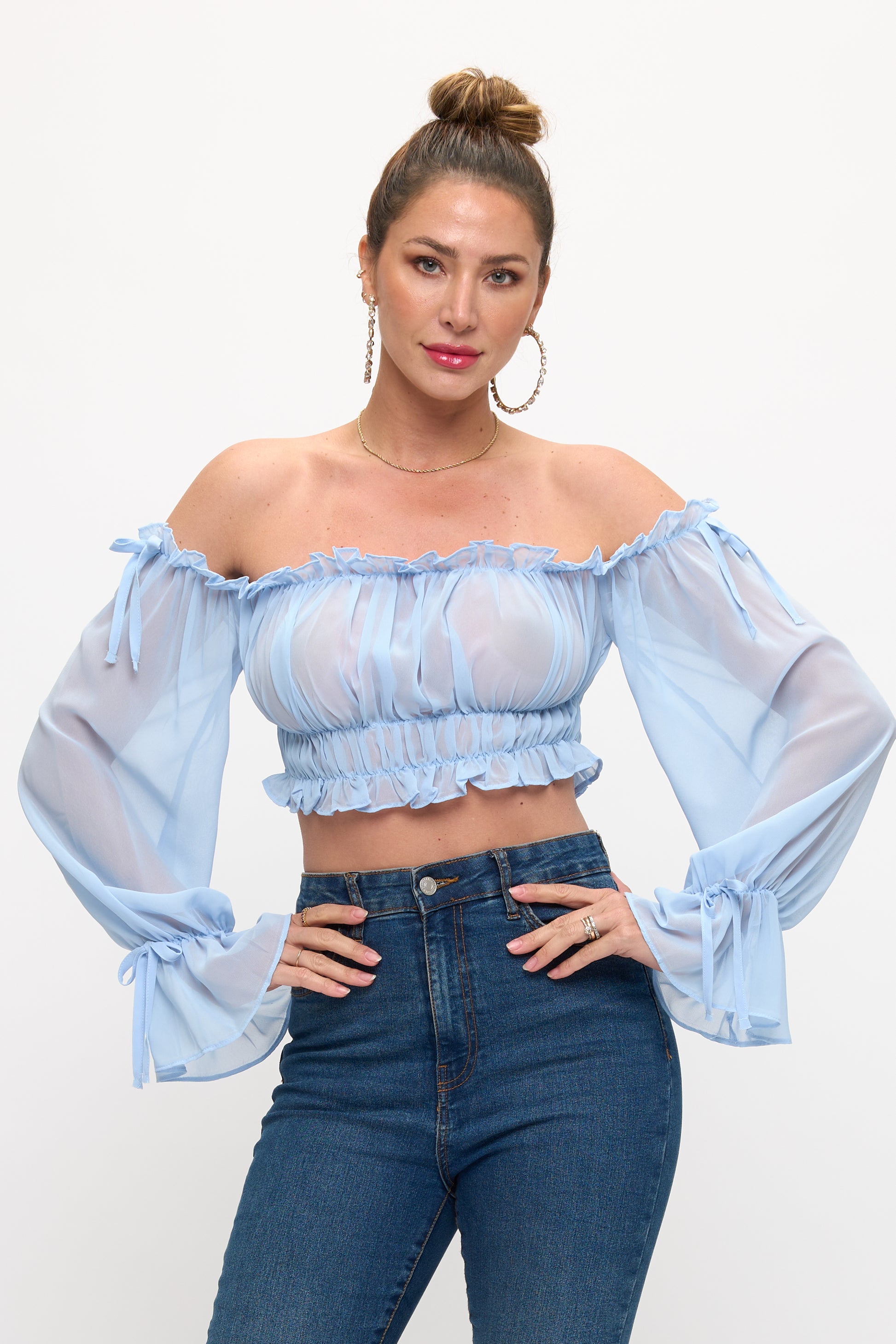 OFF SHOULDER RUFFLE TRIM KNOT SLEEVE CROP TOP