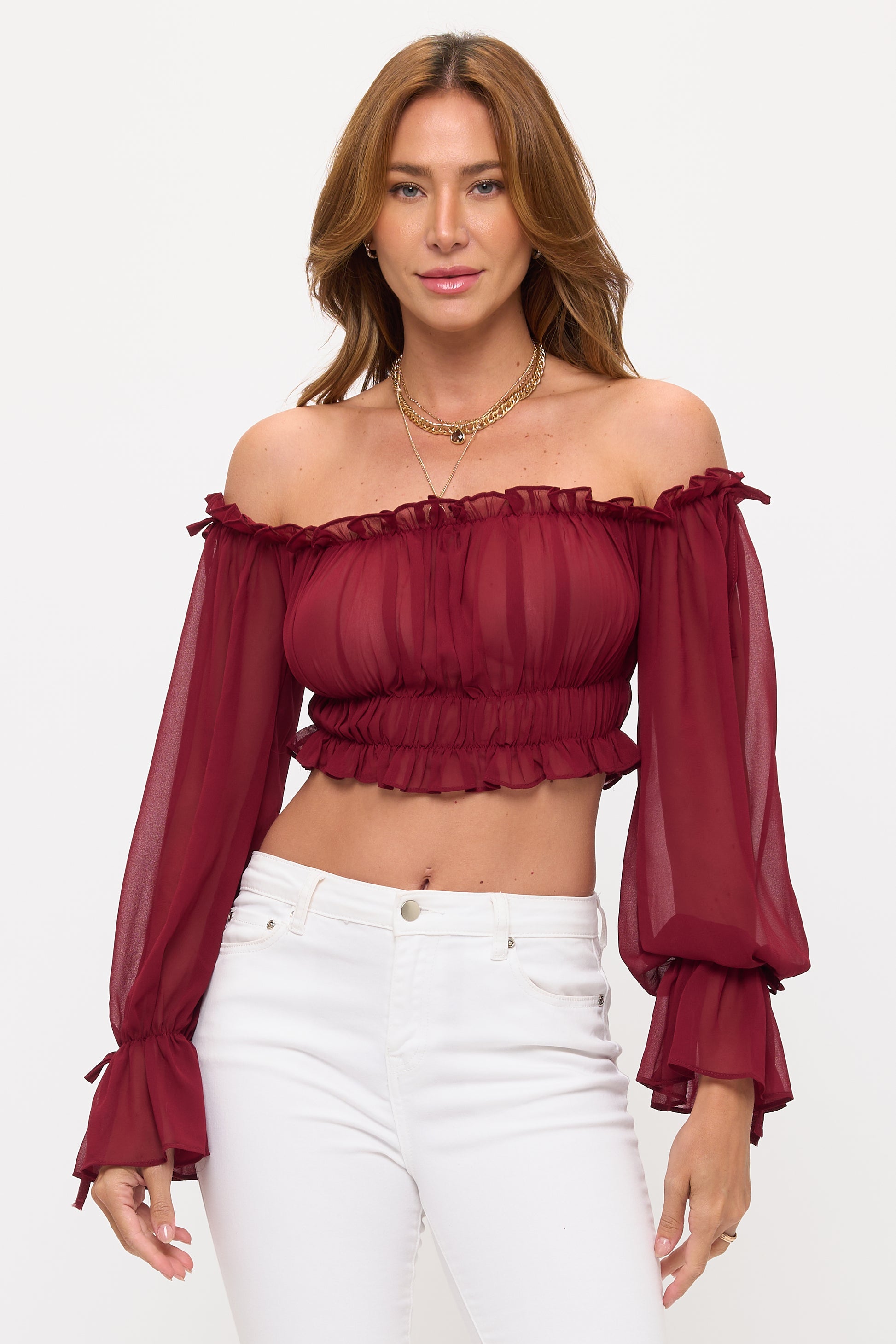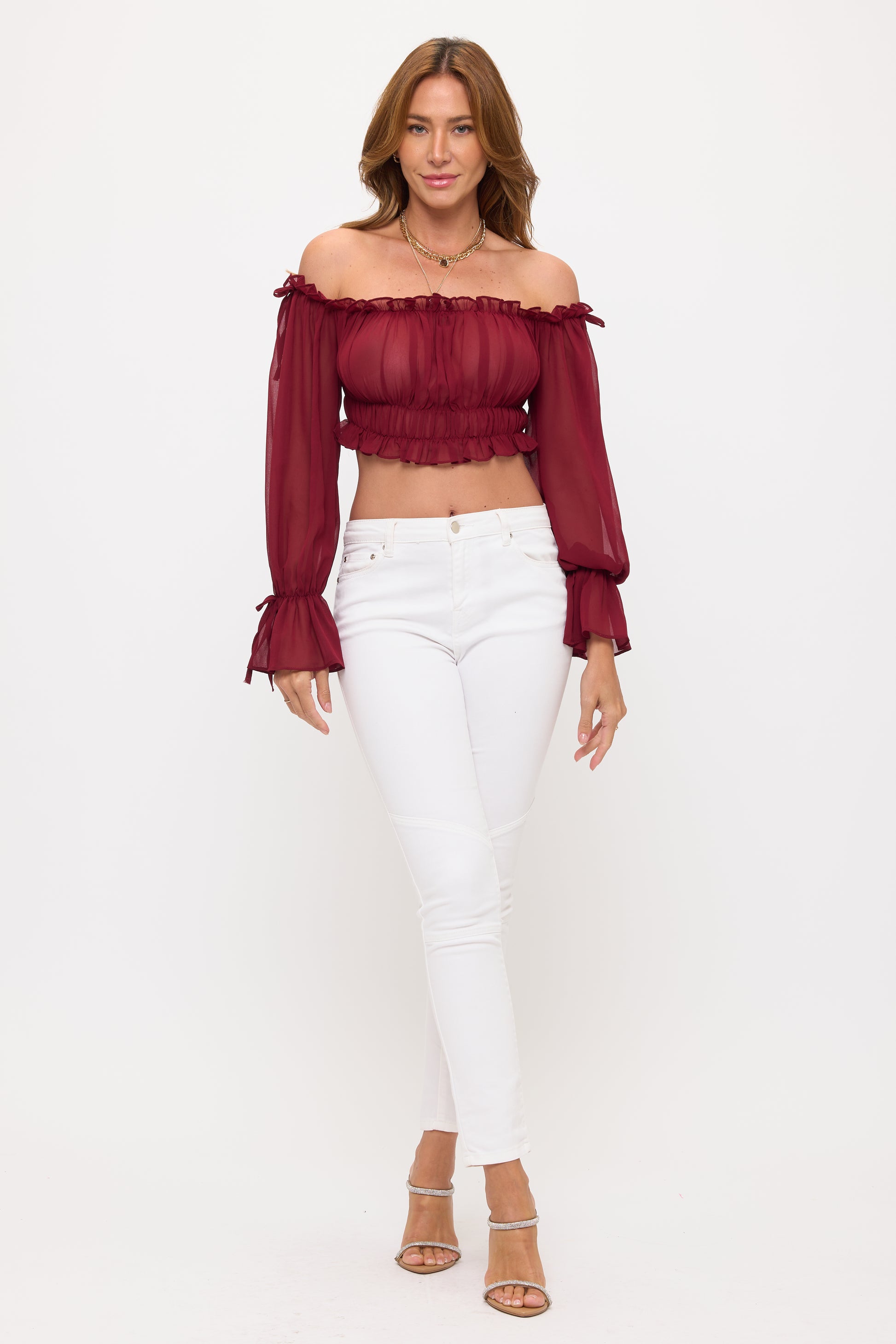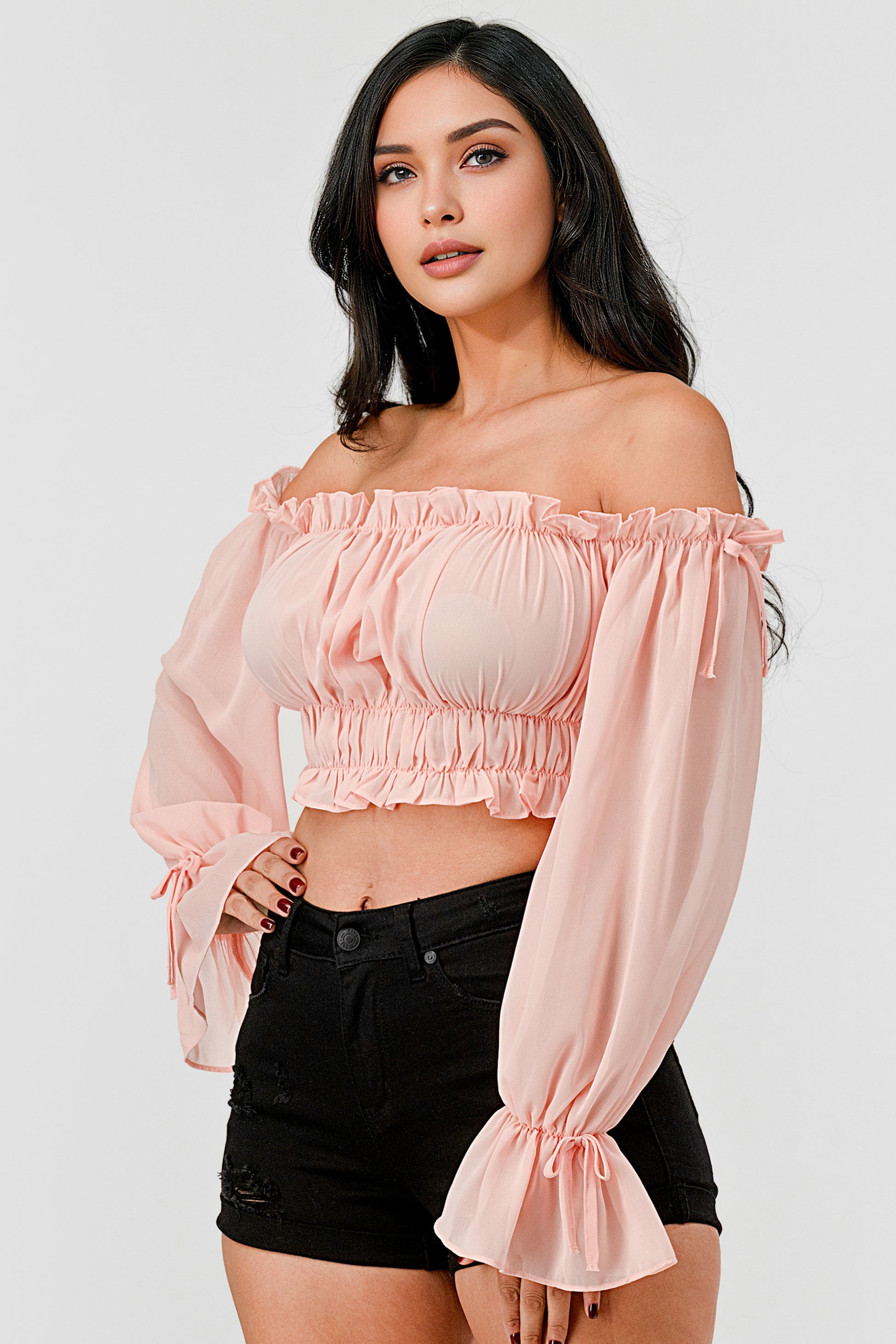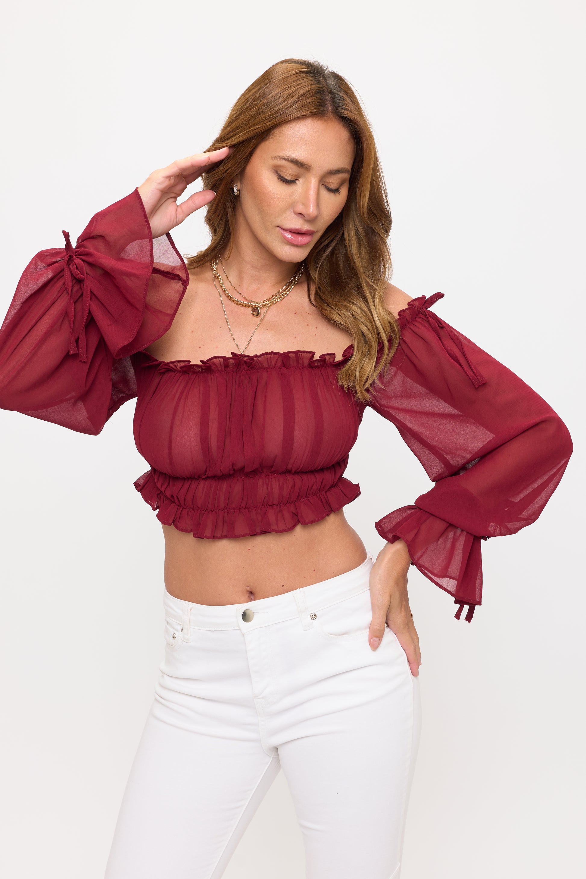OFF SHOULDER RUFFLE TRIM KNOT SLEEVE CROP TOP
