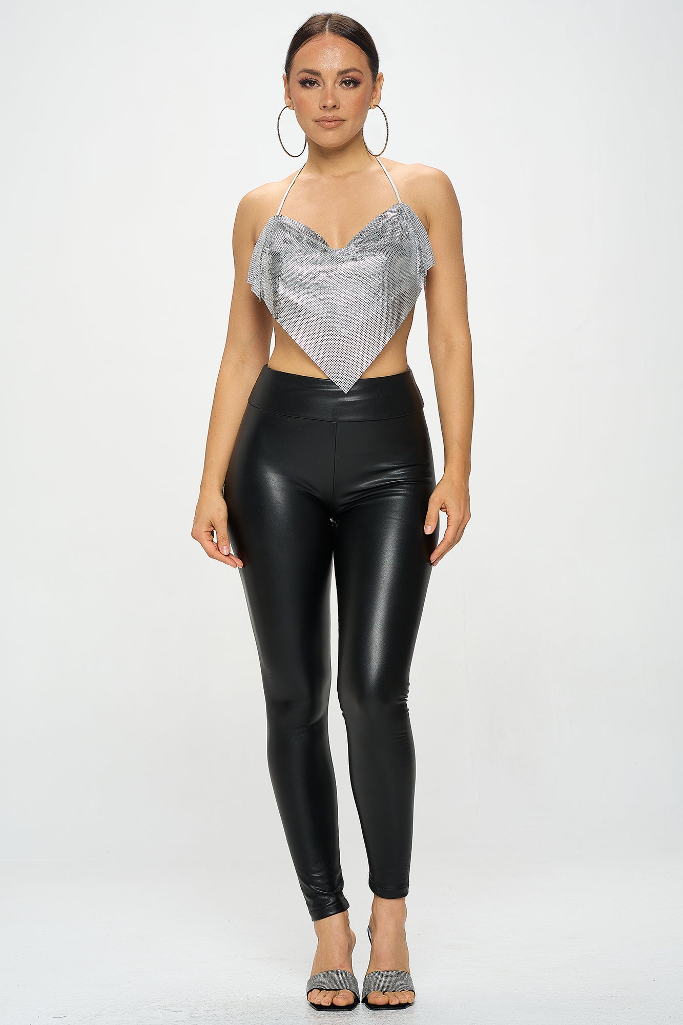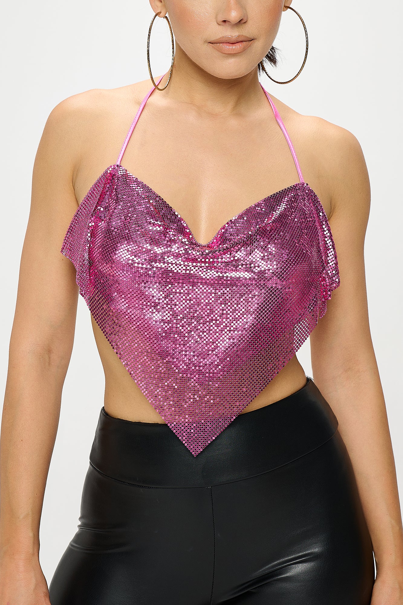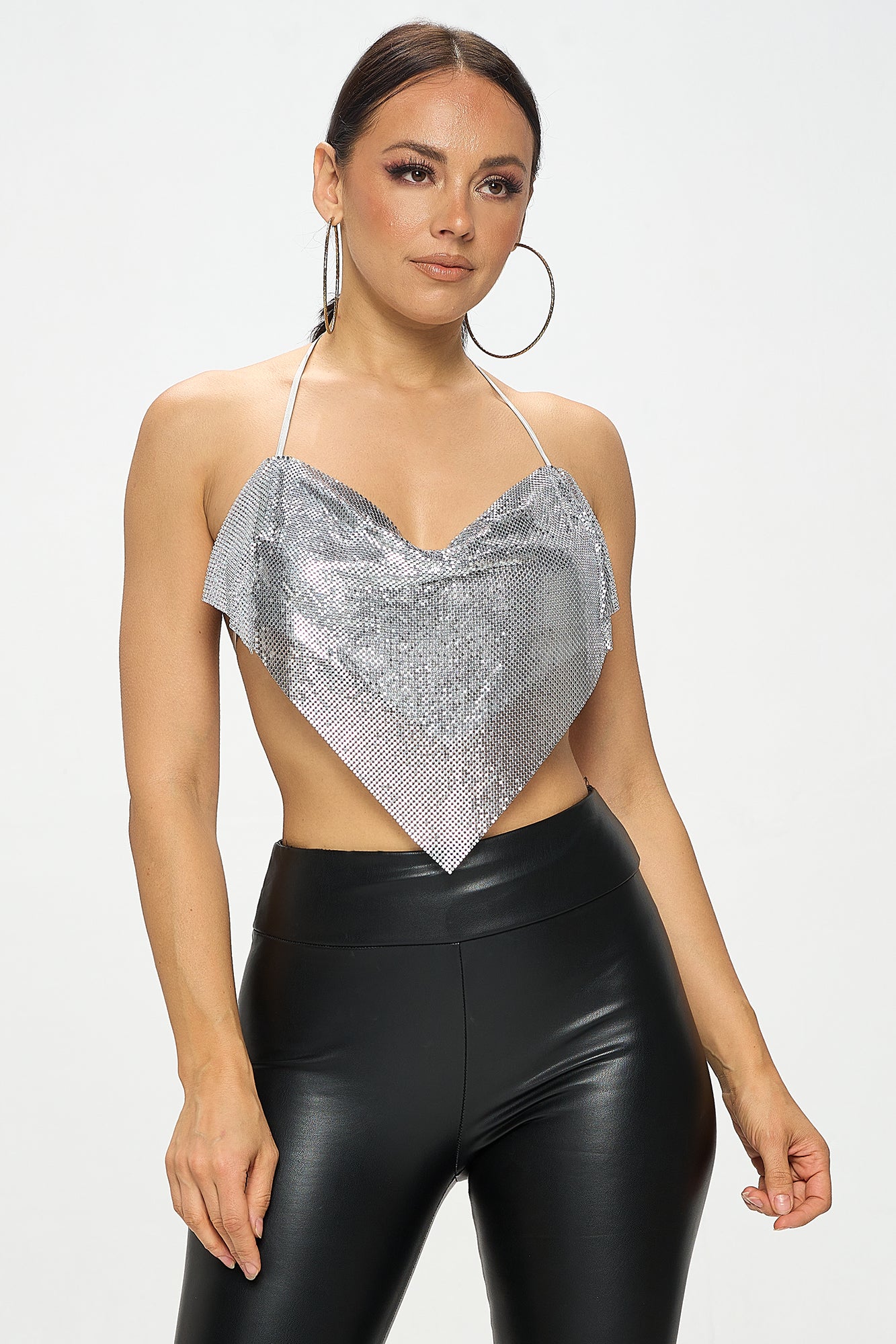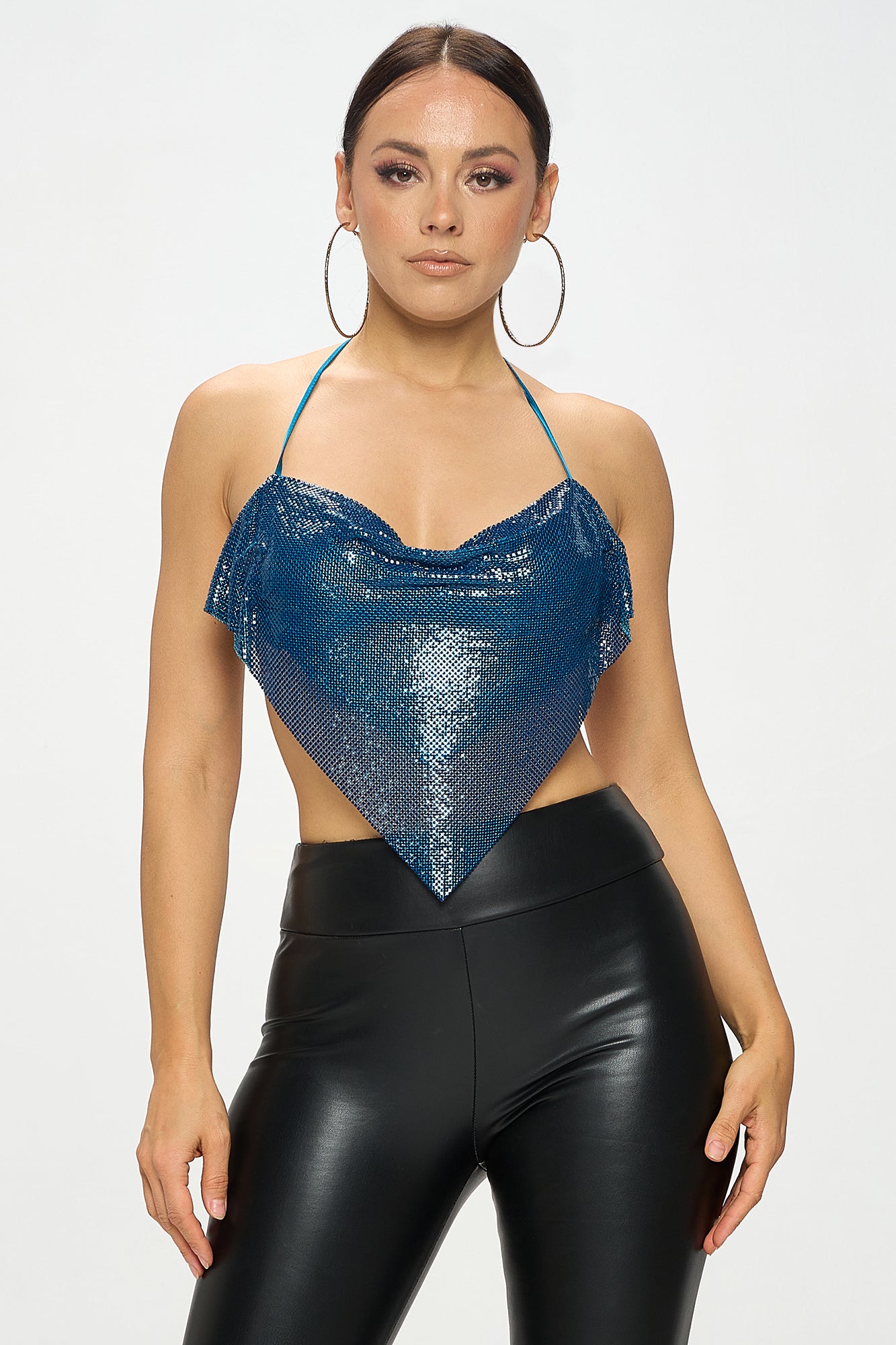 METAL CHAINMAIL BACKLESS COWL NECK HALTER TOP