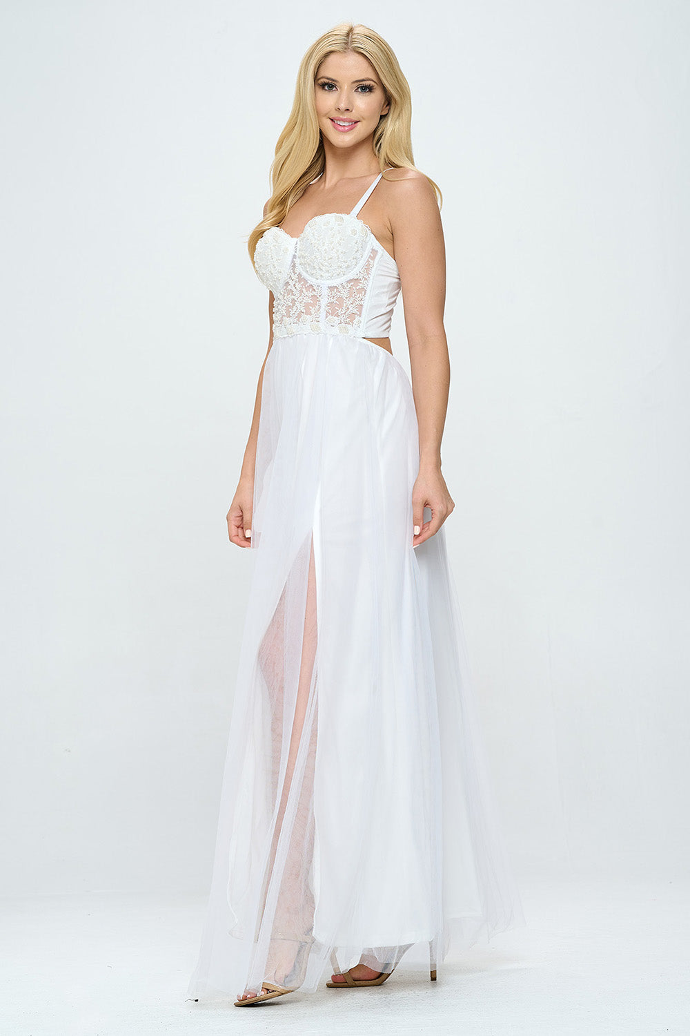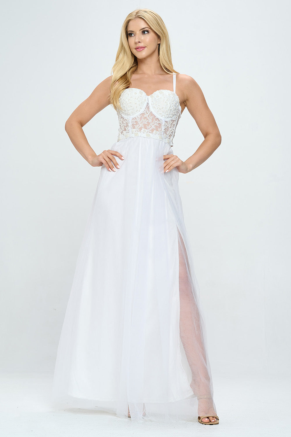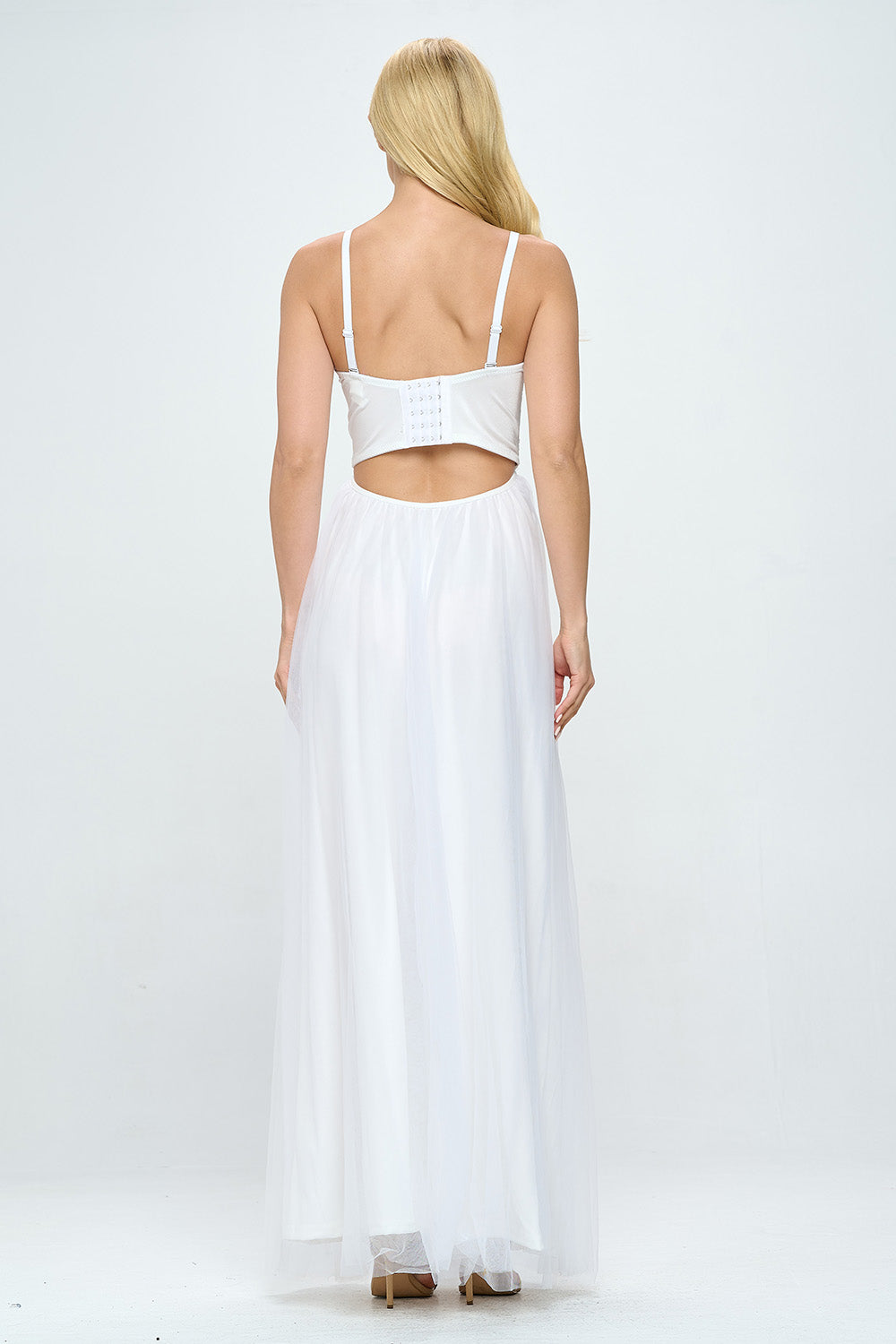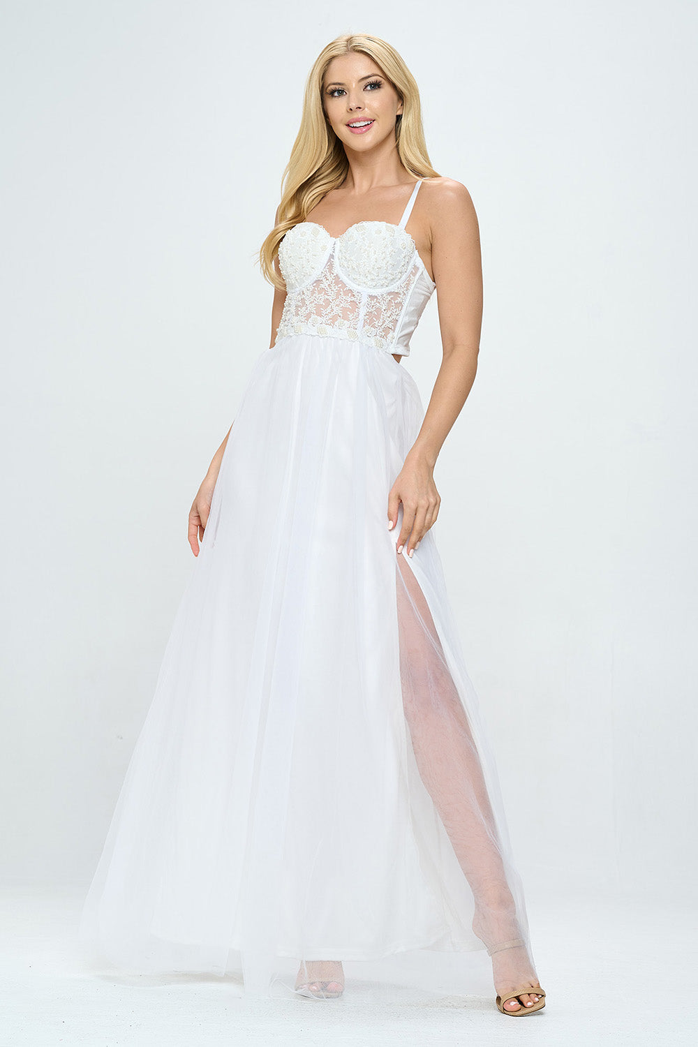 FLOWER BEADING BUSTIER LAYERED TULLE MAXI DRESS