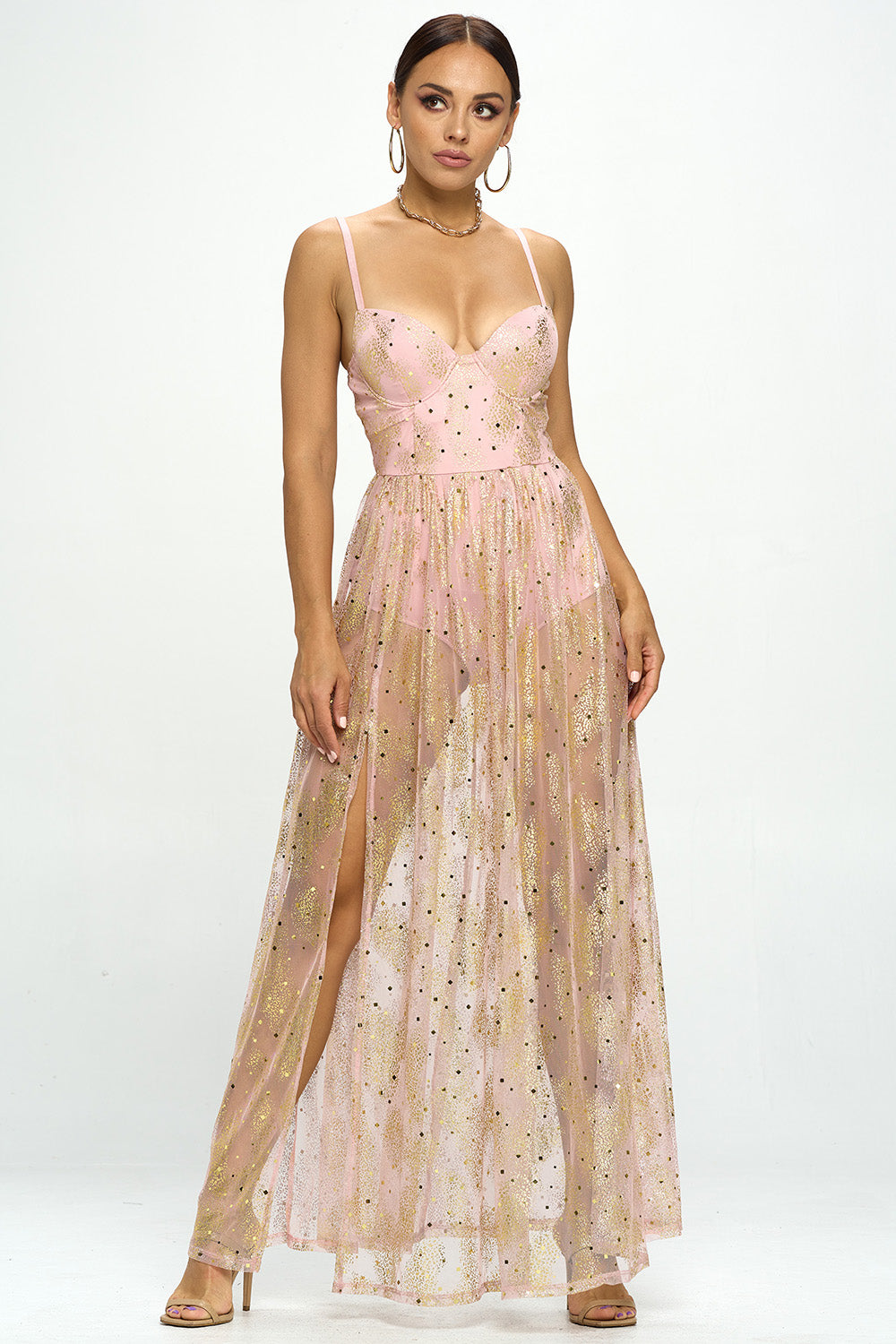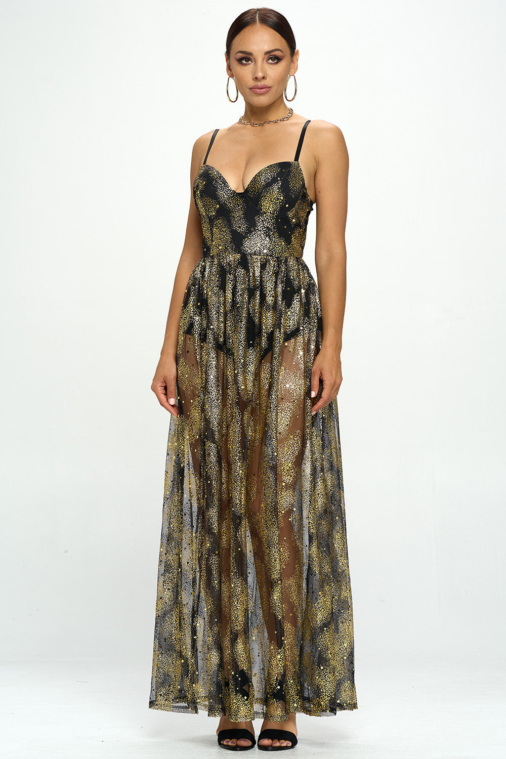 GOLD GLITTER SHEER MAXI DRESS WITH BODYSUIT LINING