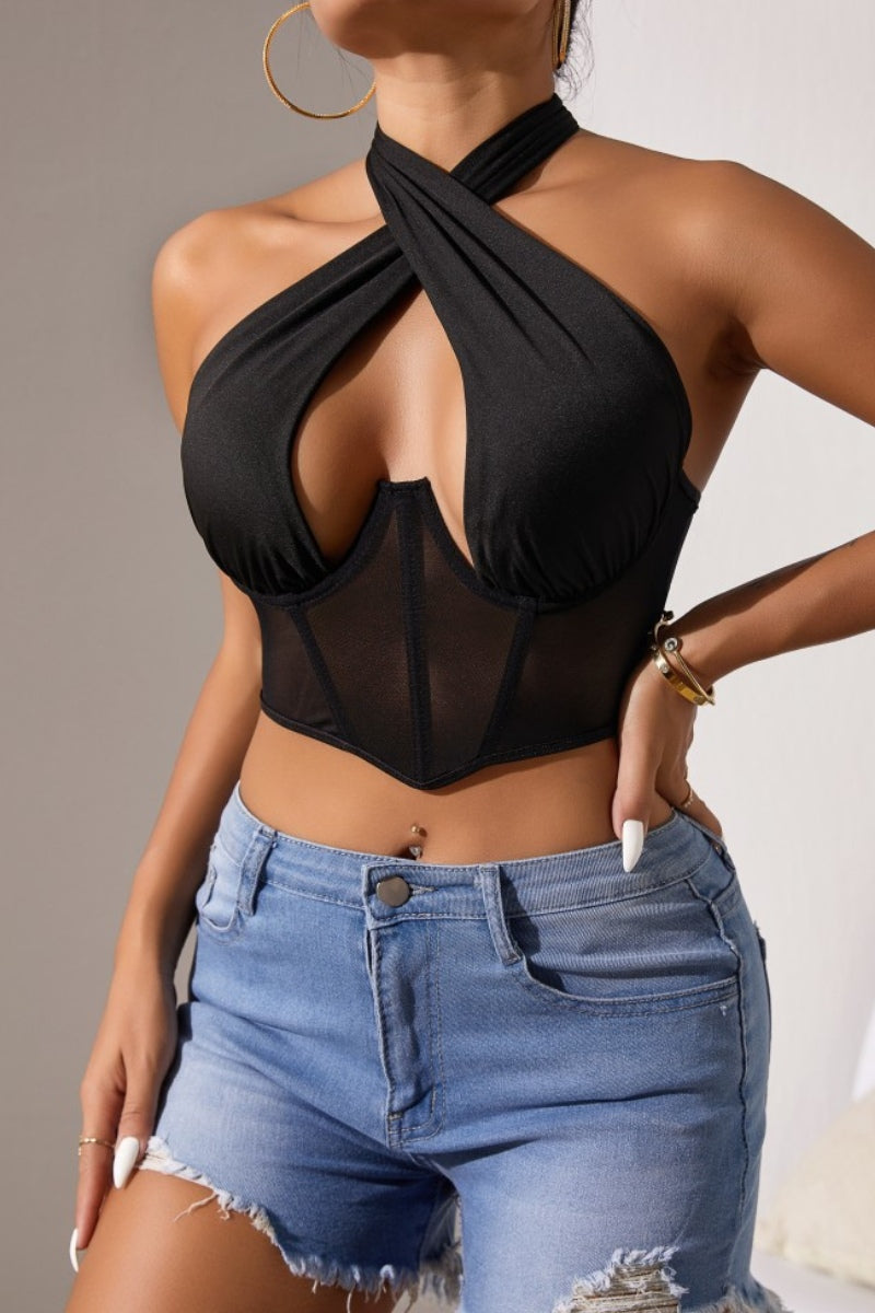 HALTER CRISS CROSS MESH CORSET CROP TOP