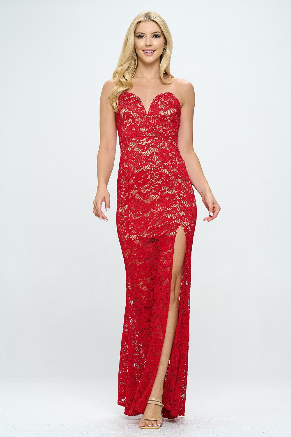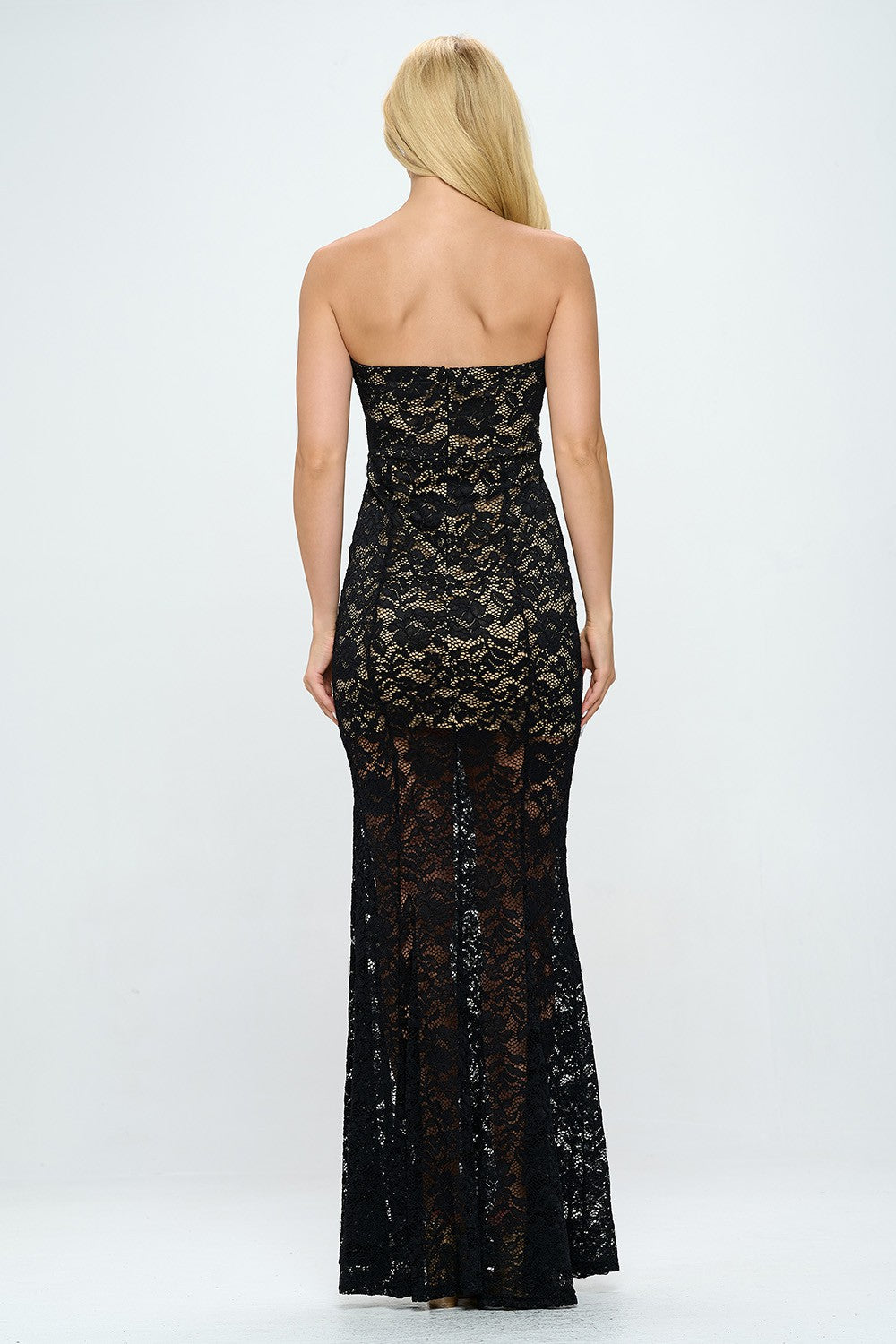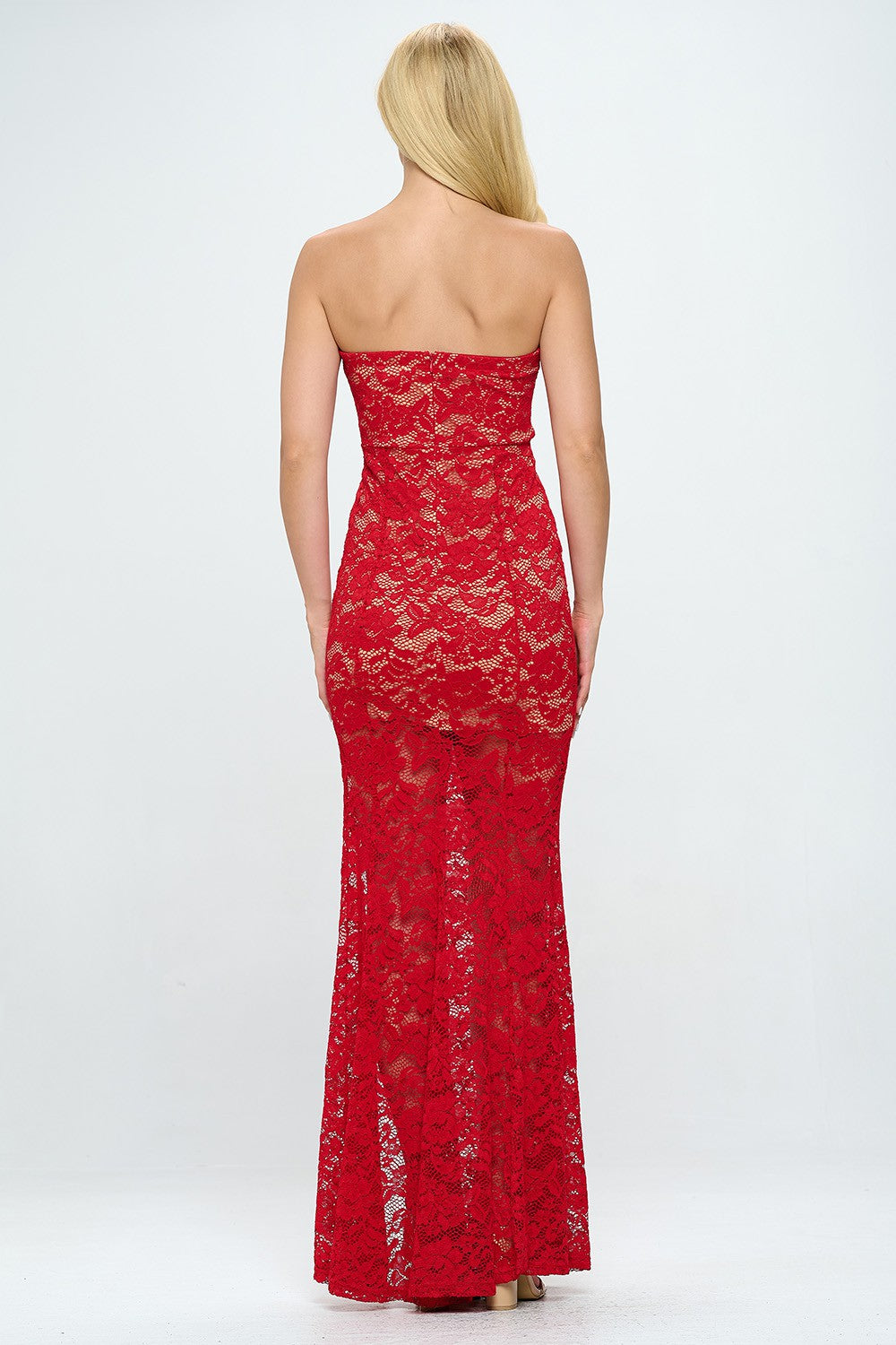 This stylish Lace Detail Tube Slit Maxi Dress is perfect for any special occasion. Featuring lace detail and a tube dress silhouette with a playful side slit, this maxi dress is perfect for proms and other special occasions. The design makes you look elegant and chic.