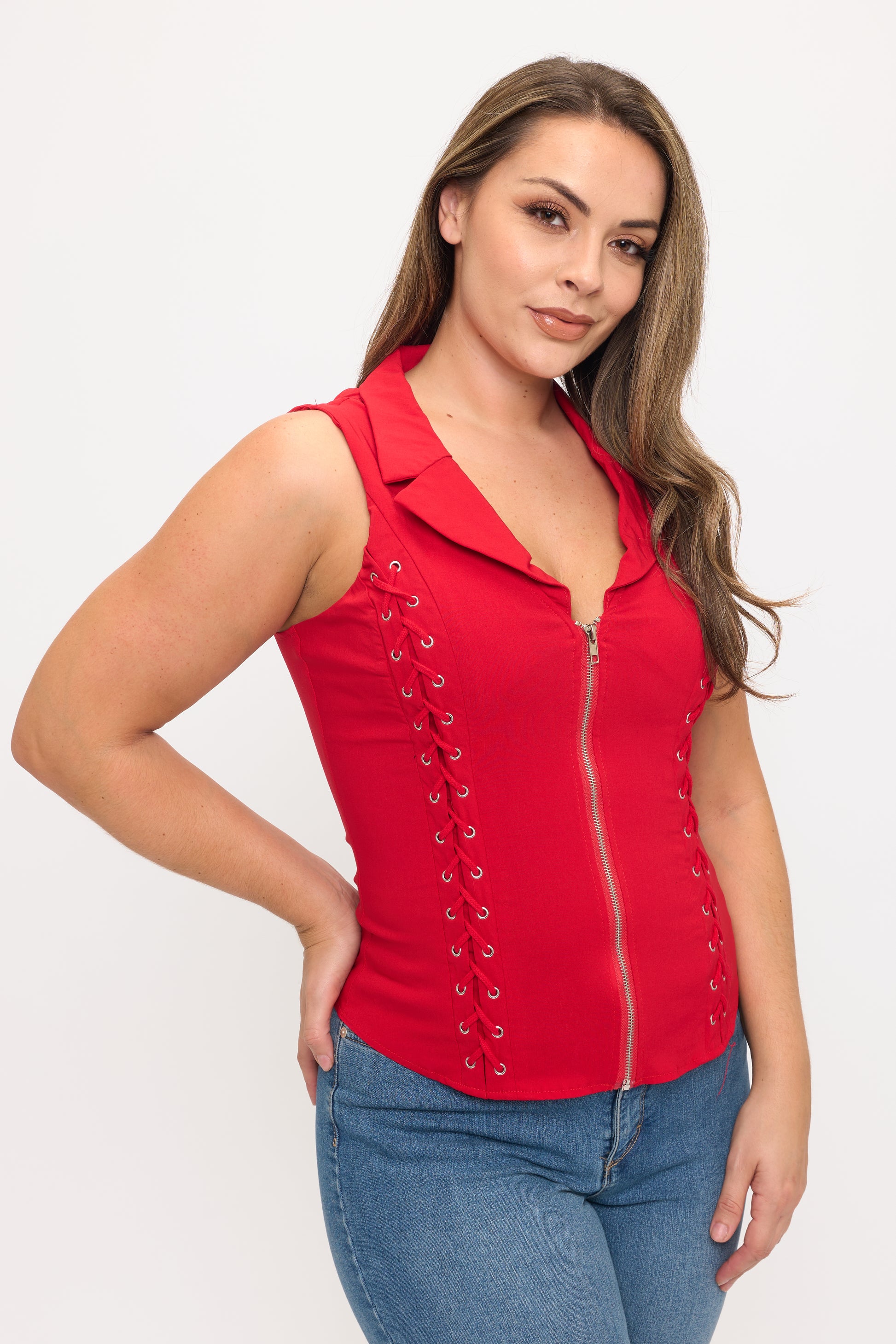 LACE UP DETAIL FRONT COLLARED TANK TOP-PLUS