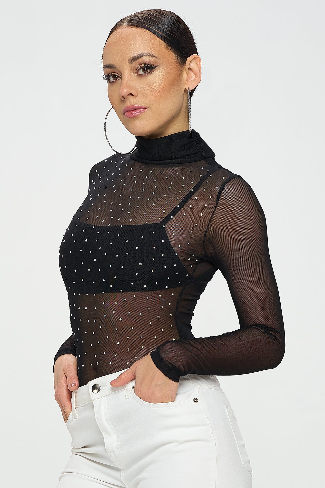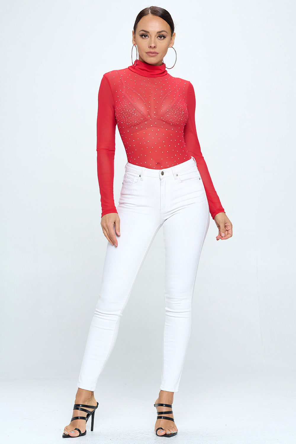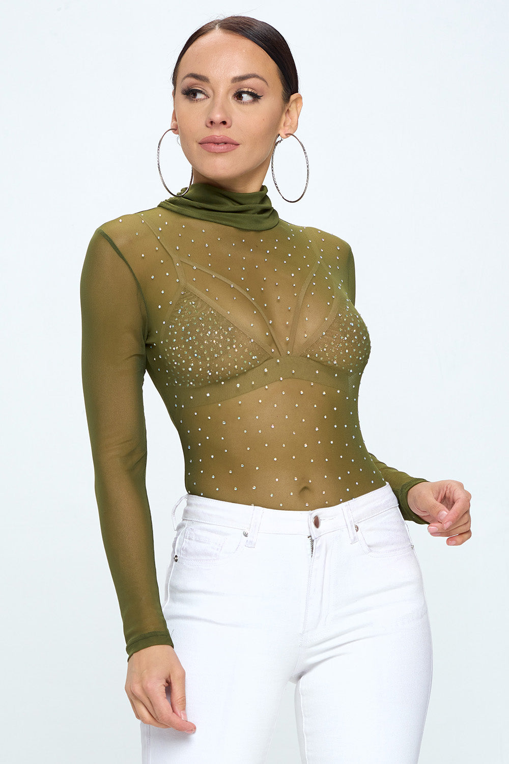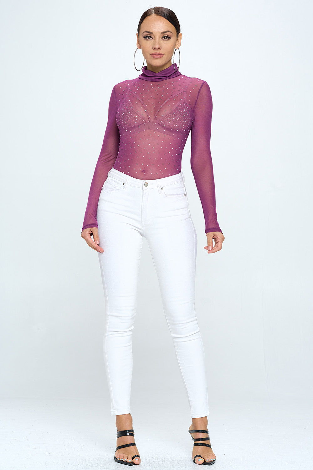 LONG SLEEVE MOCK NECK RHINESTONE MESH BODYSUIT