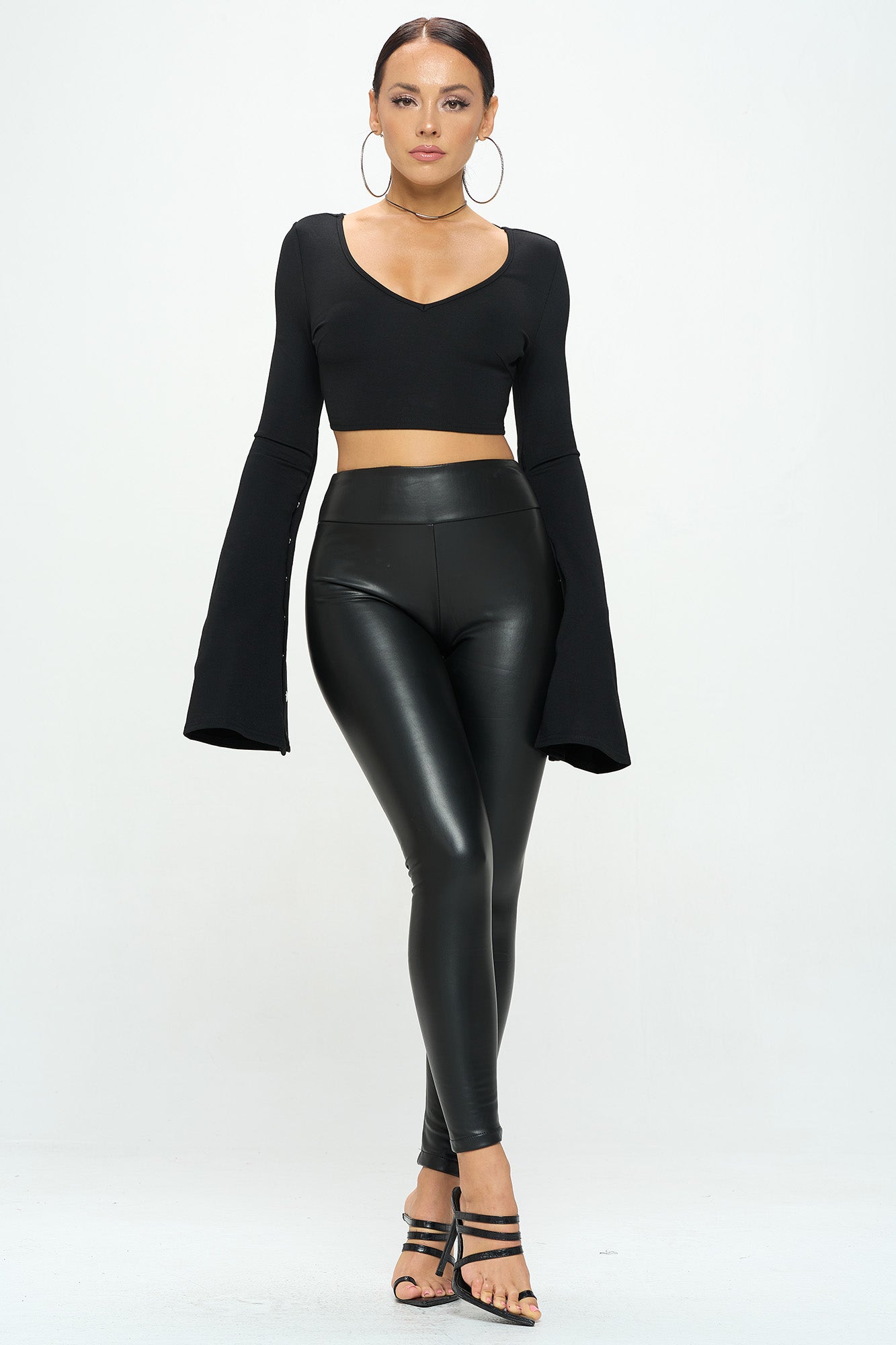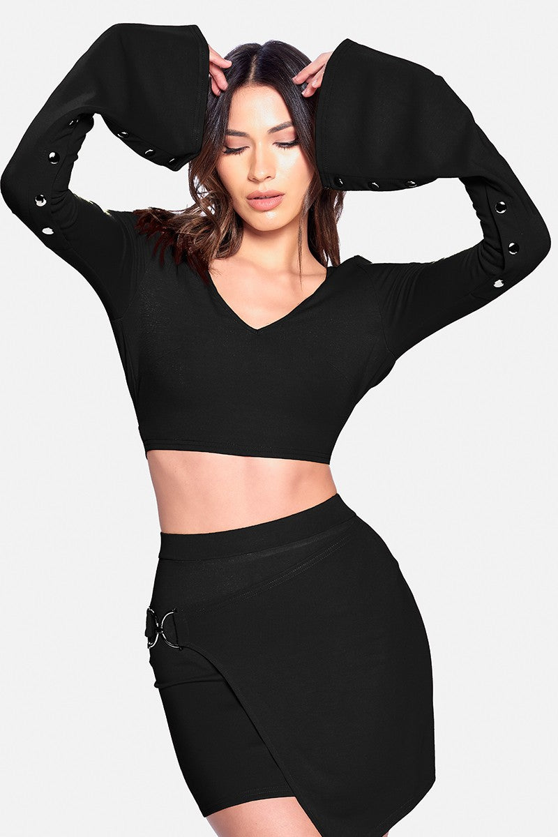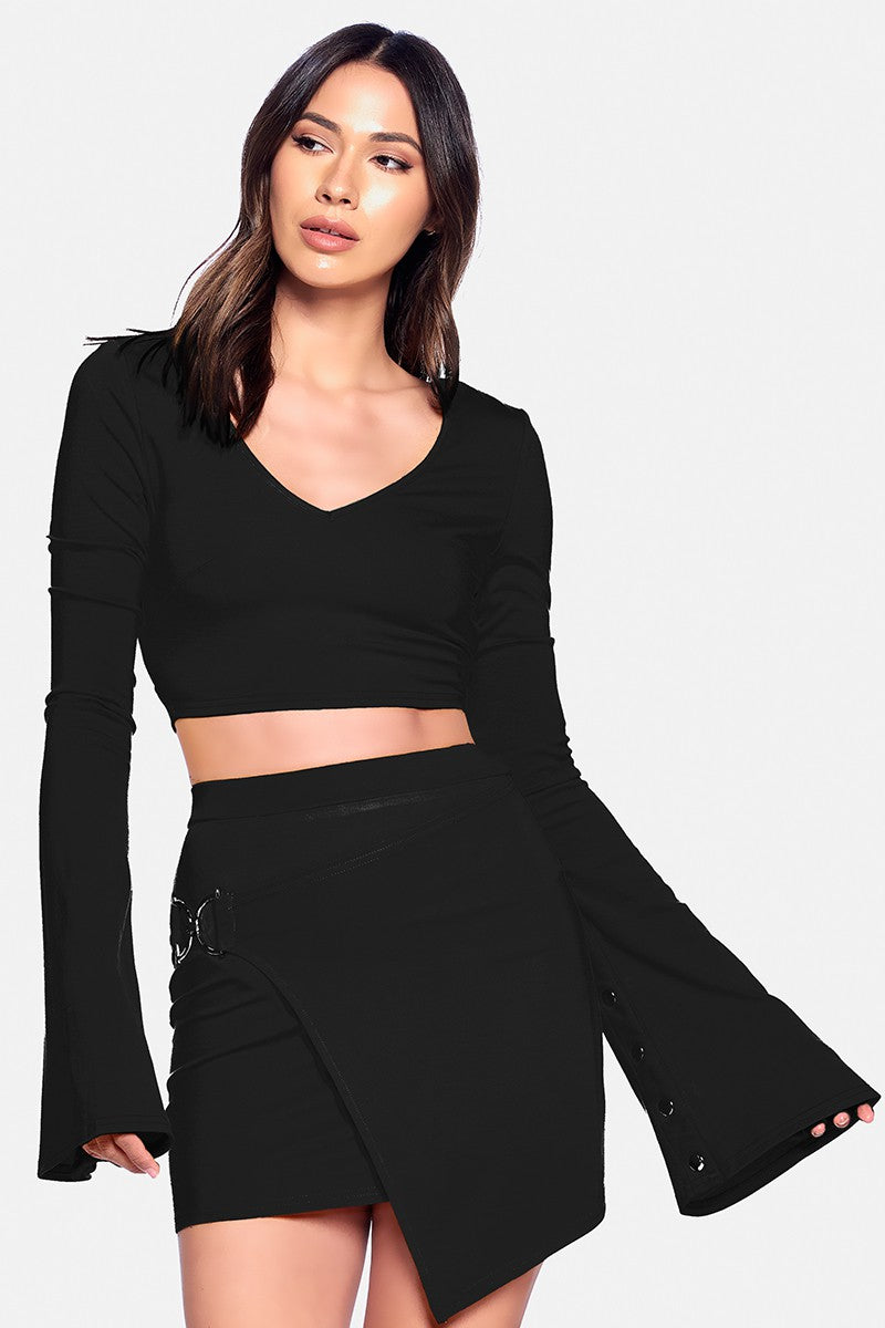 LONG FLARE SLEEVE OPEN BACK BUCKLED CROP TOP