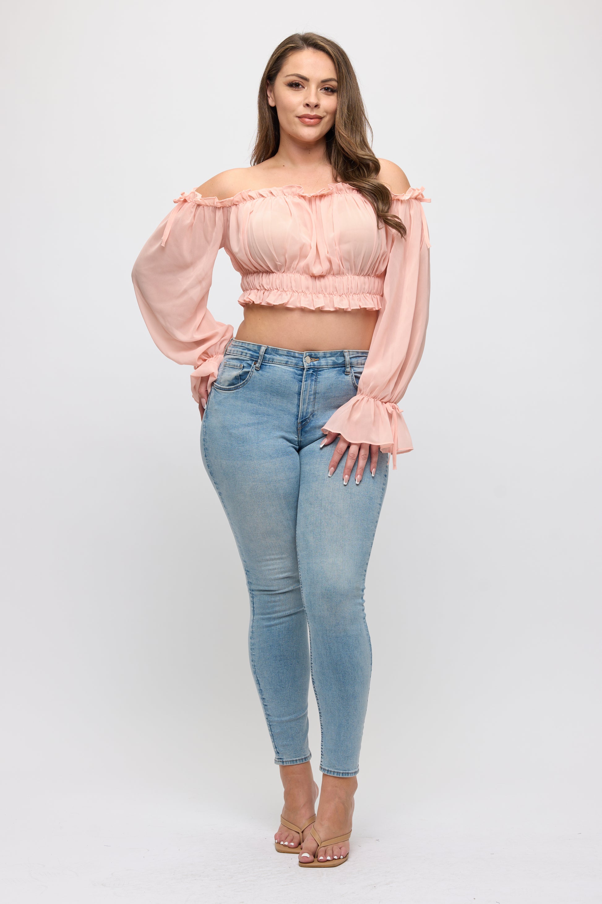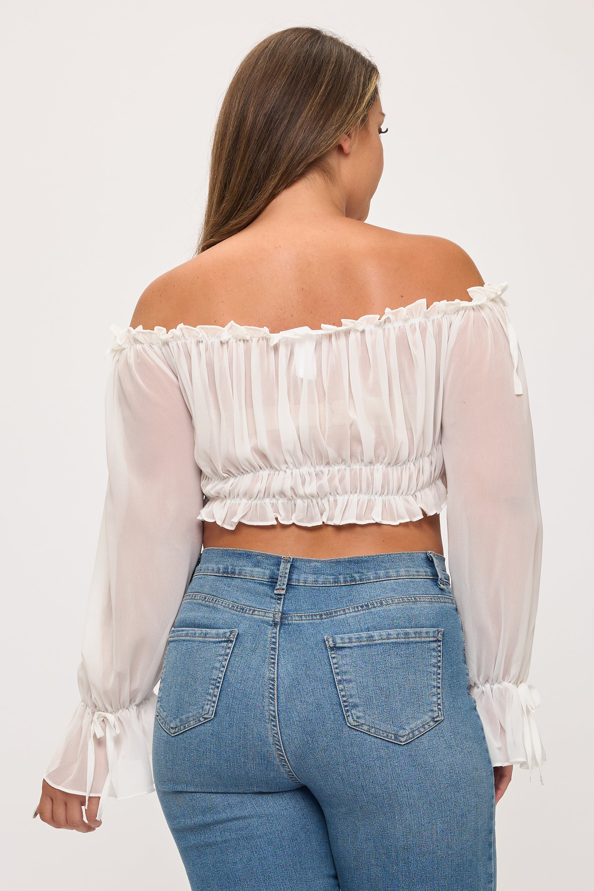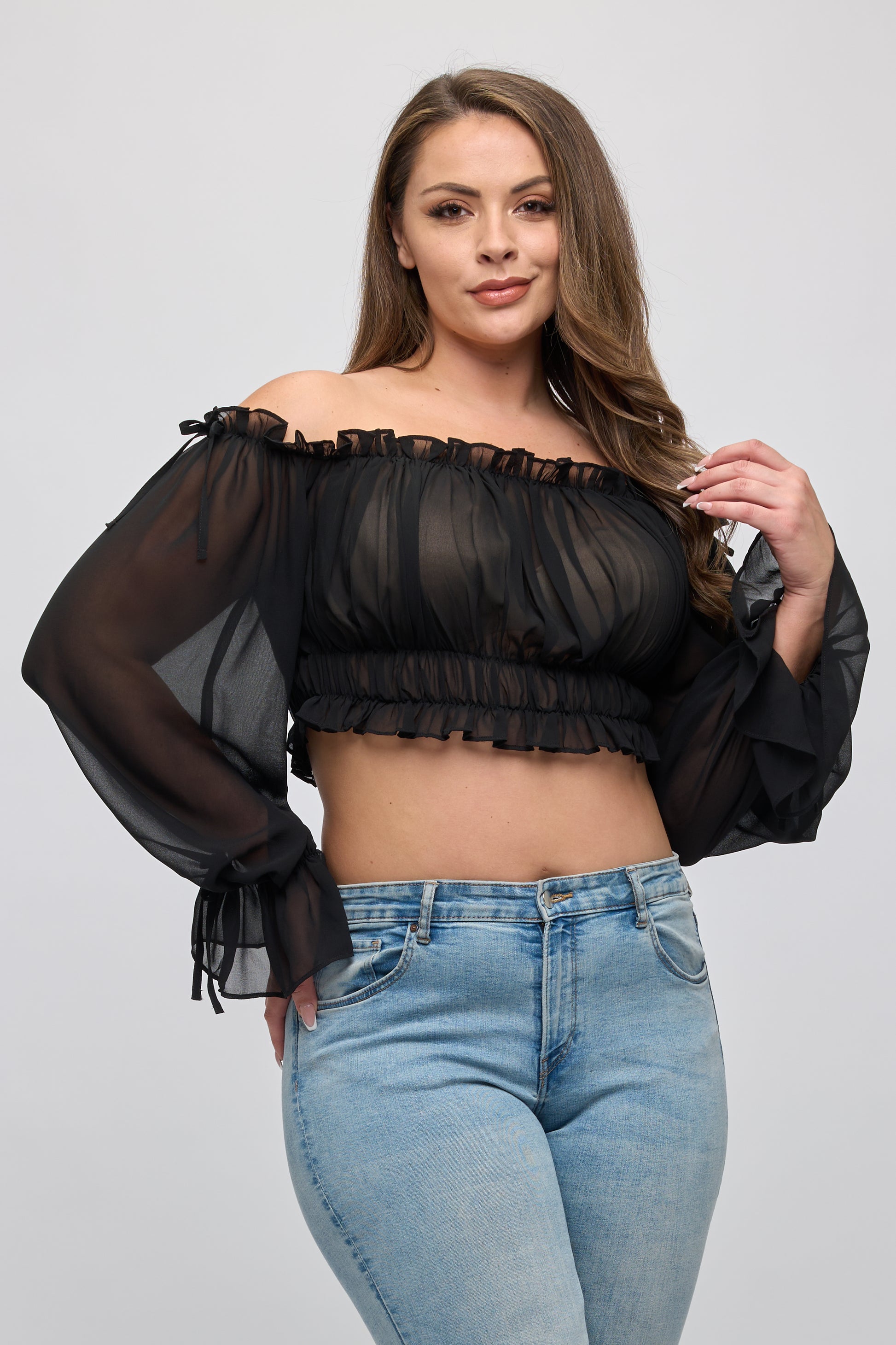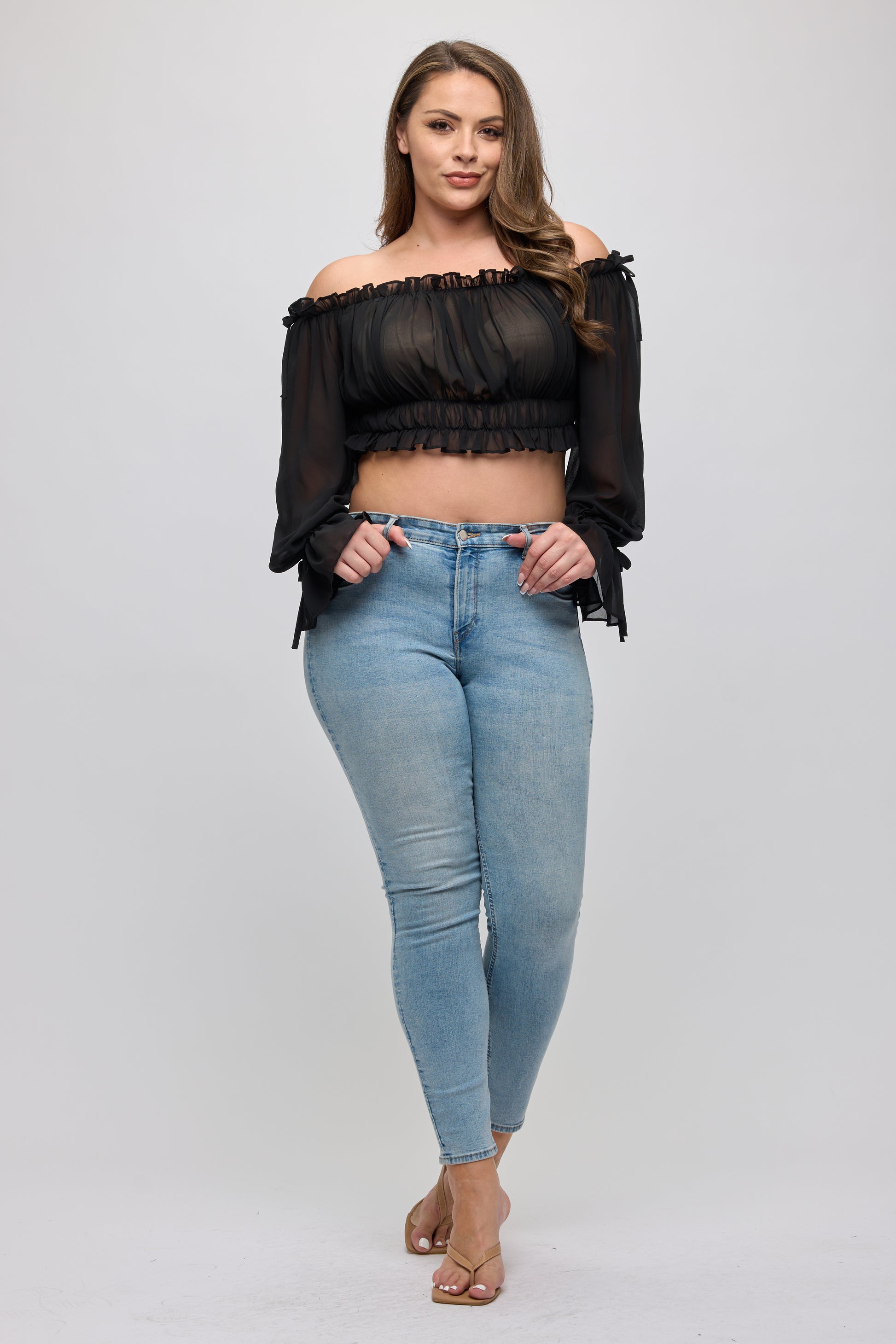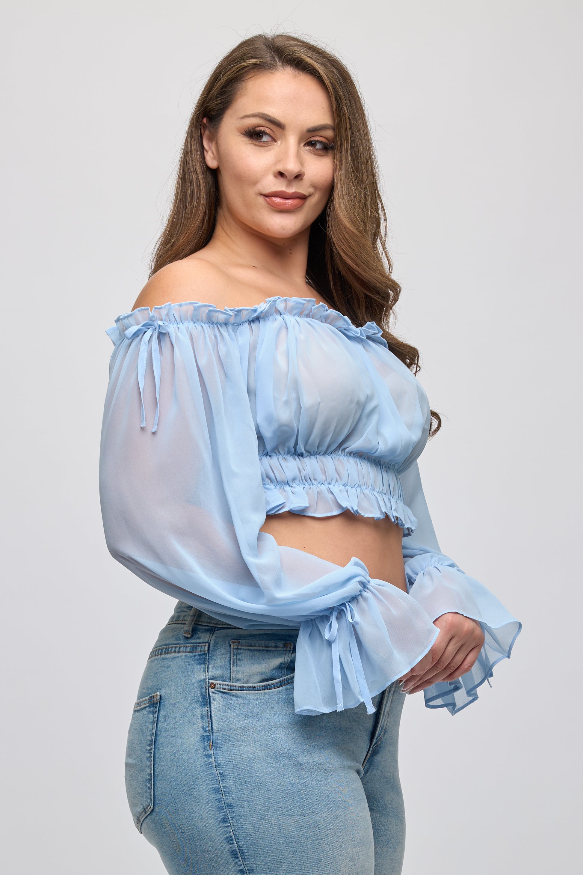 OFF SHOULDER RUFFLE TRIM KNOT SLEEVE CROP TOP PLUS