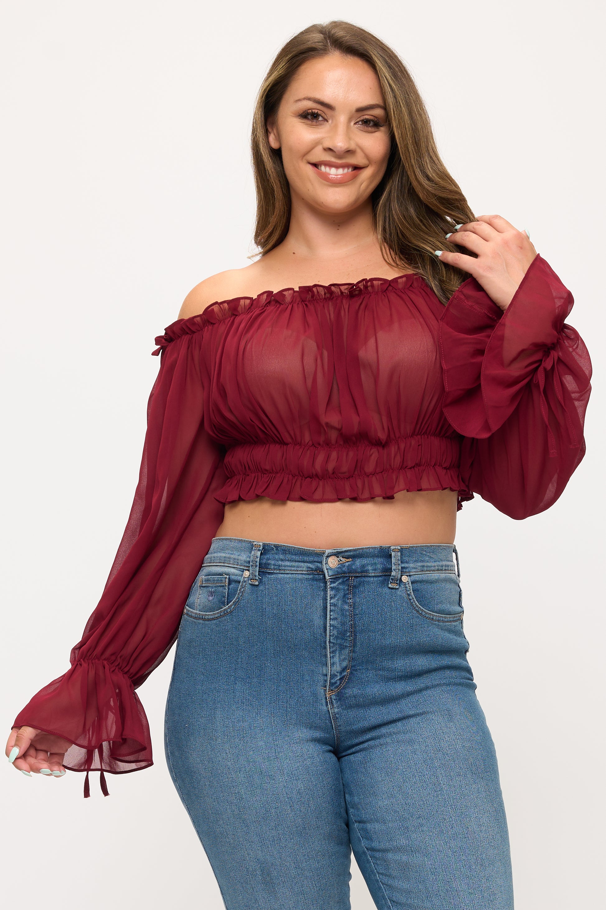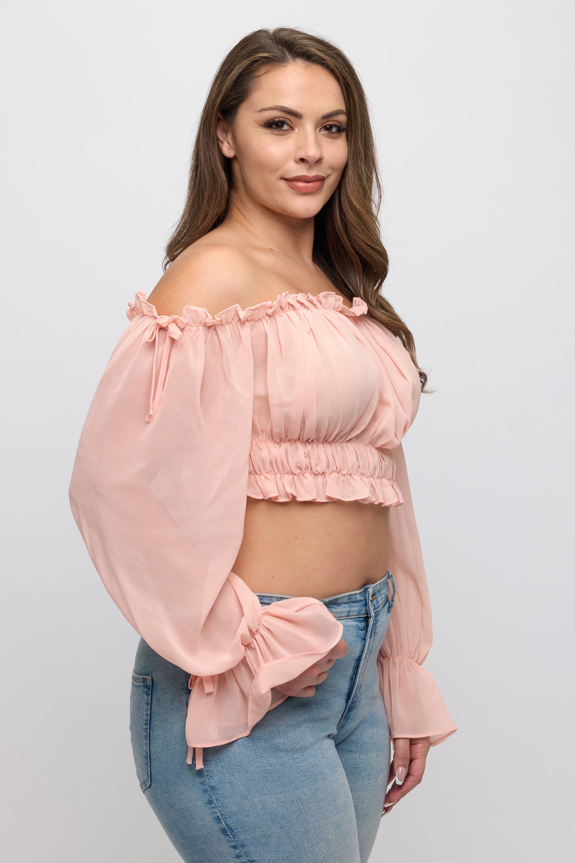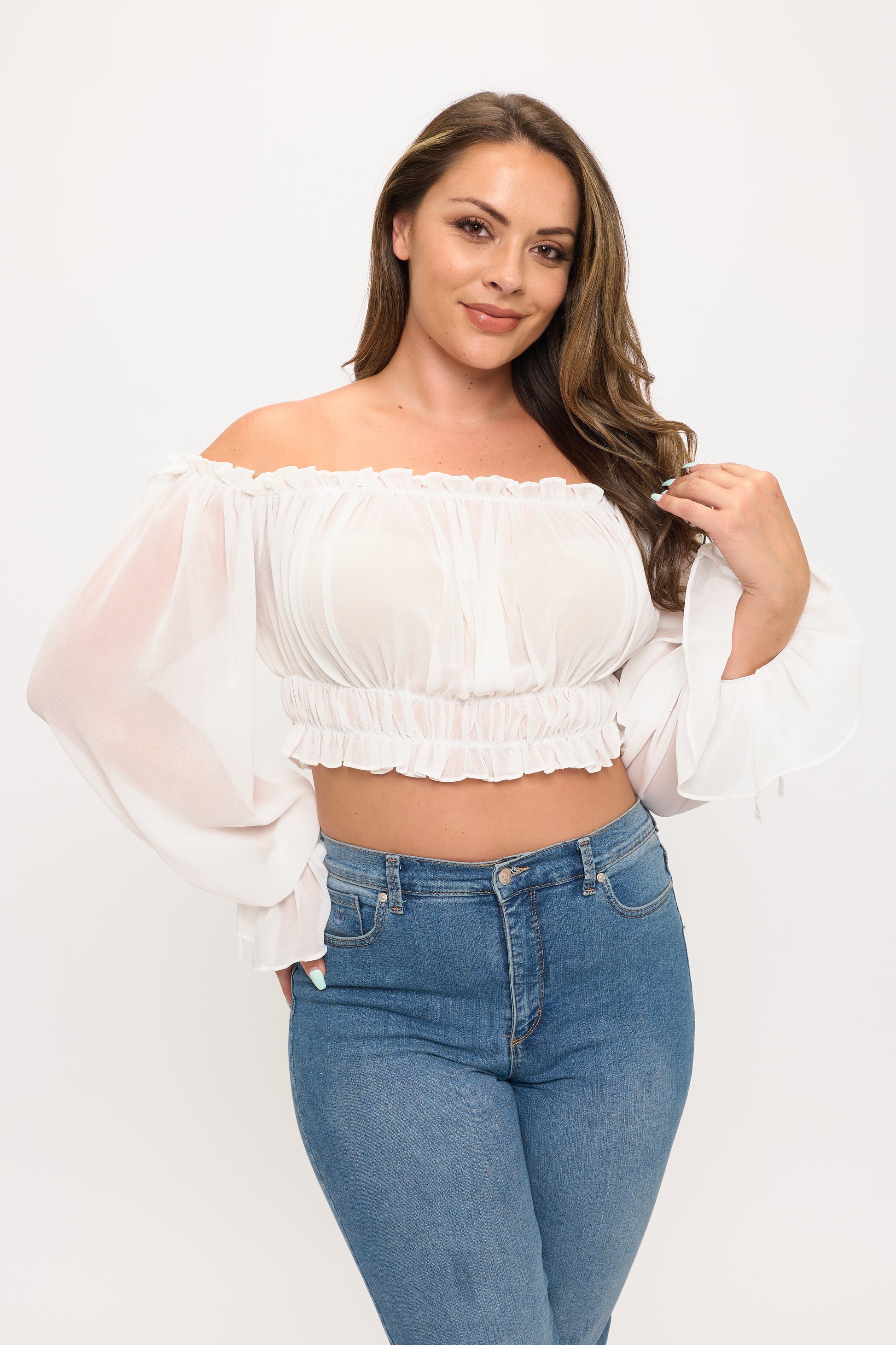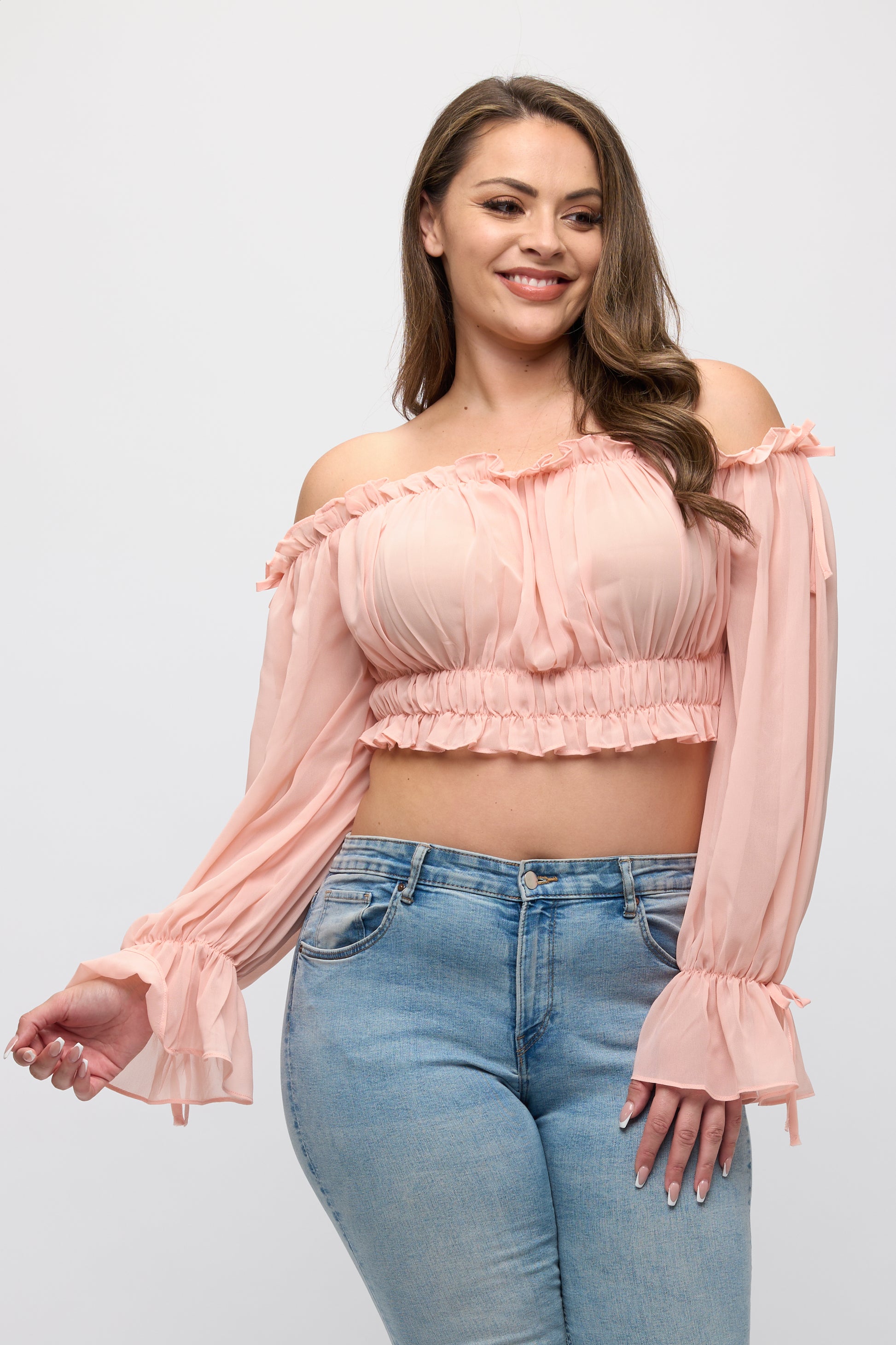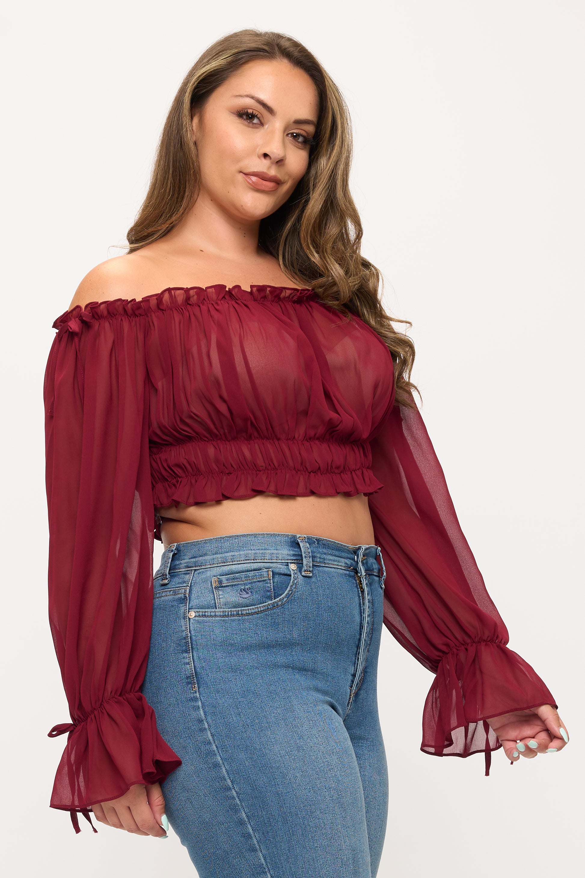 OFF SHOULDER RUFFLE TRIM KNOT SLEEVE CROP TOP PLUS