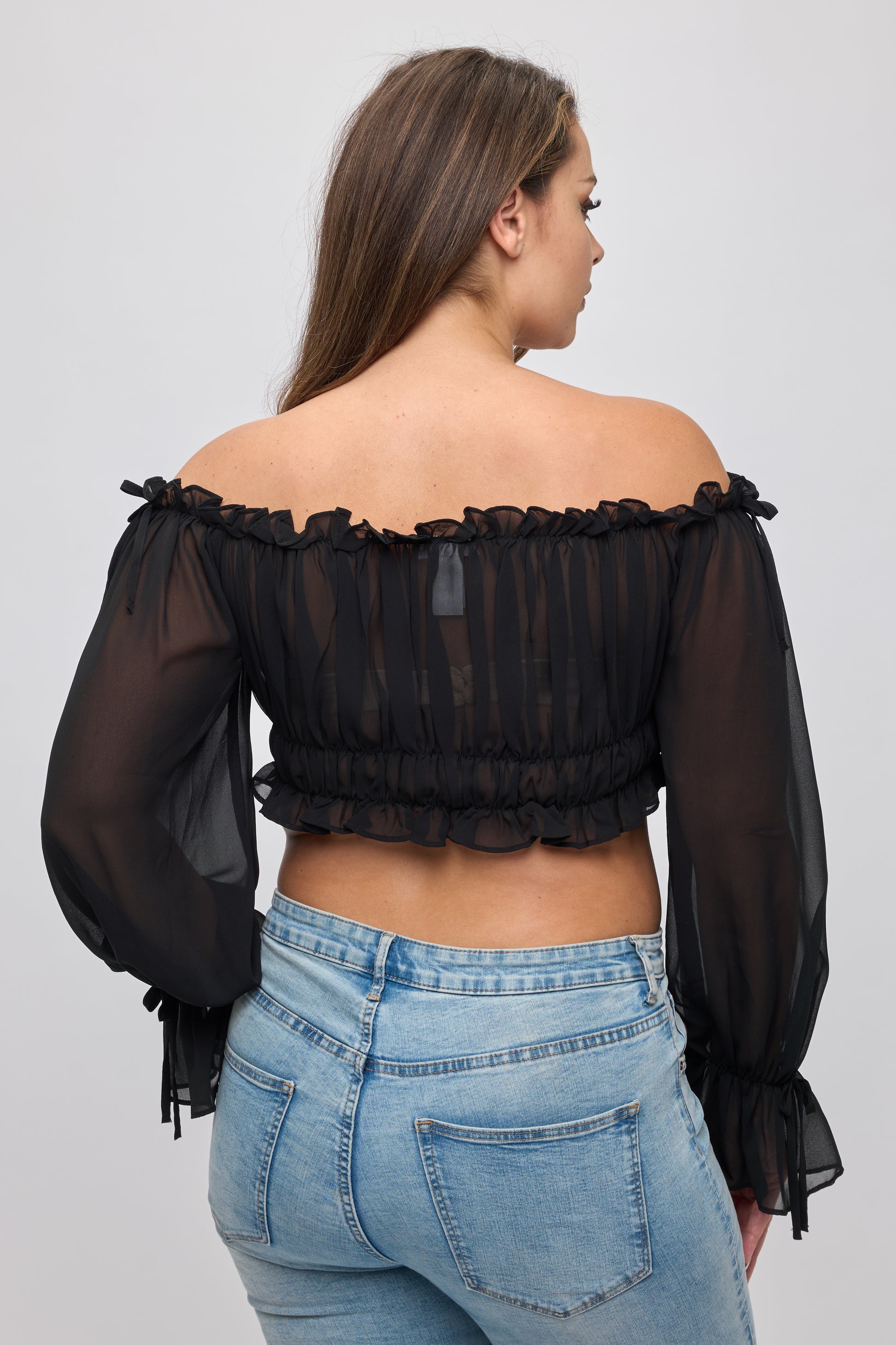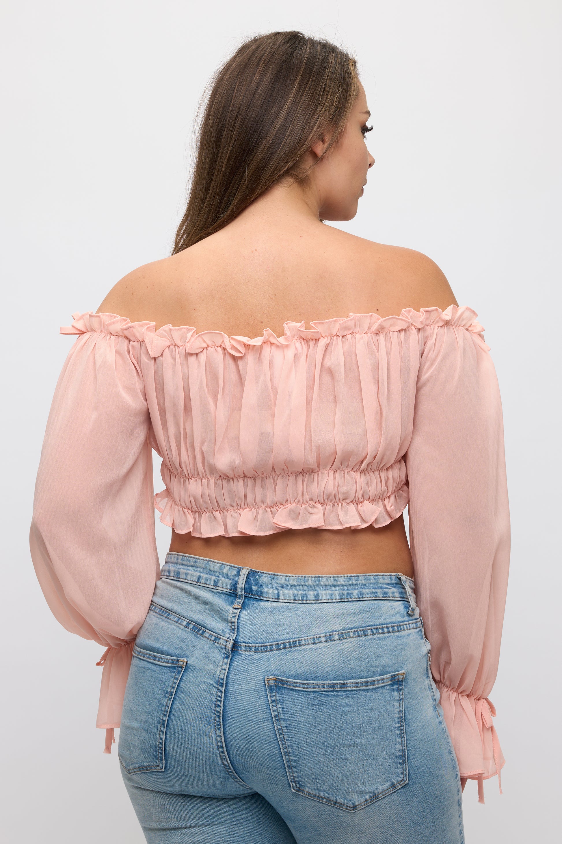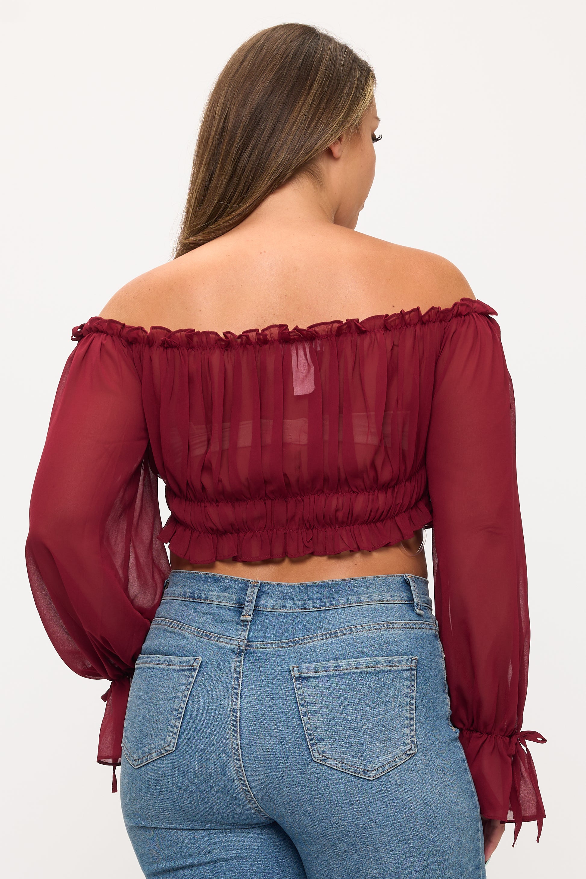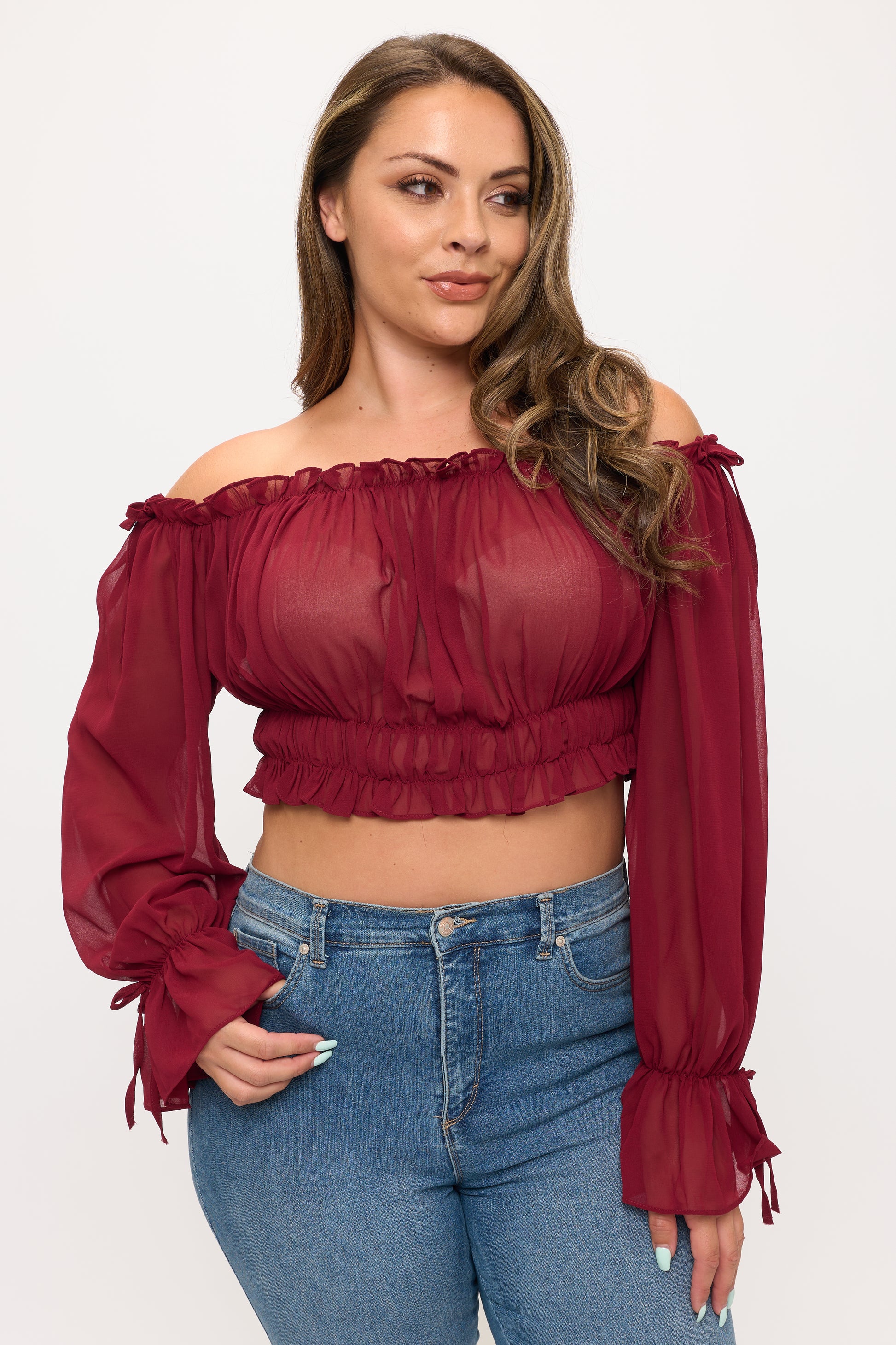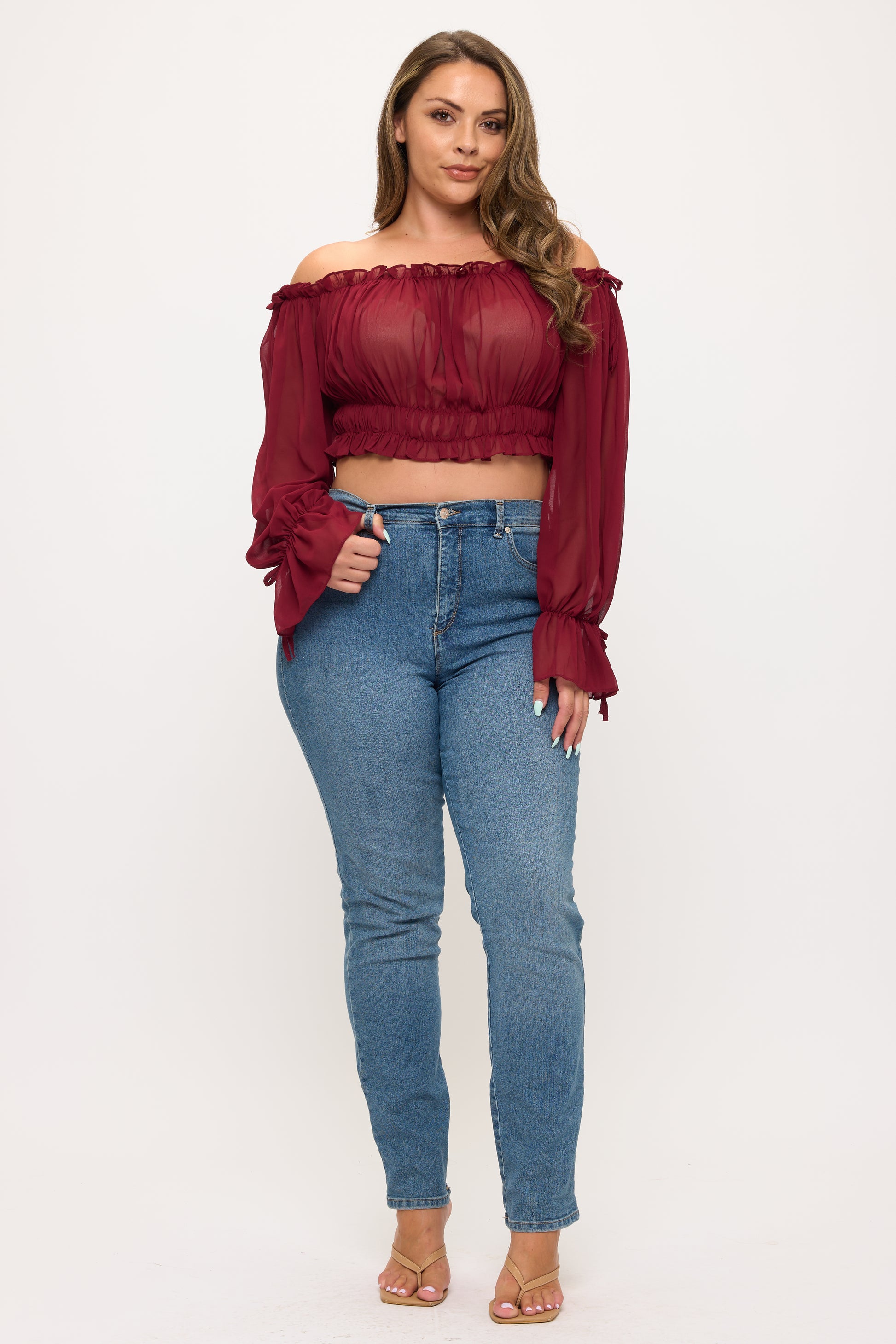 OFF SHOULDER RUFFLE TRIM KNOT SLEEVE CROP TOP PLUS