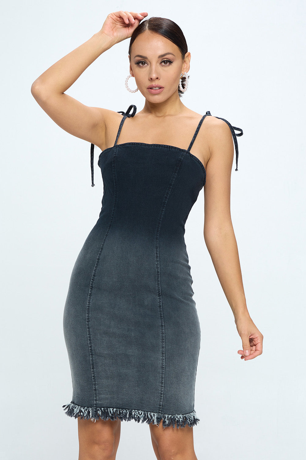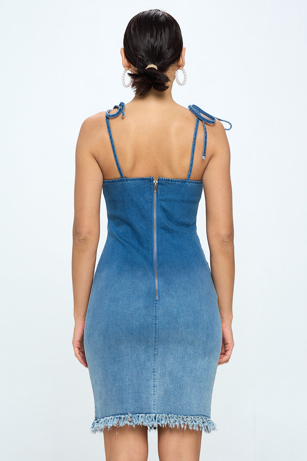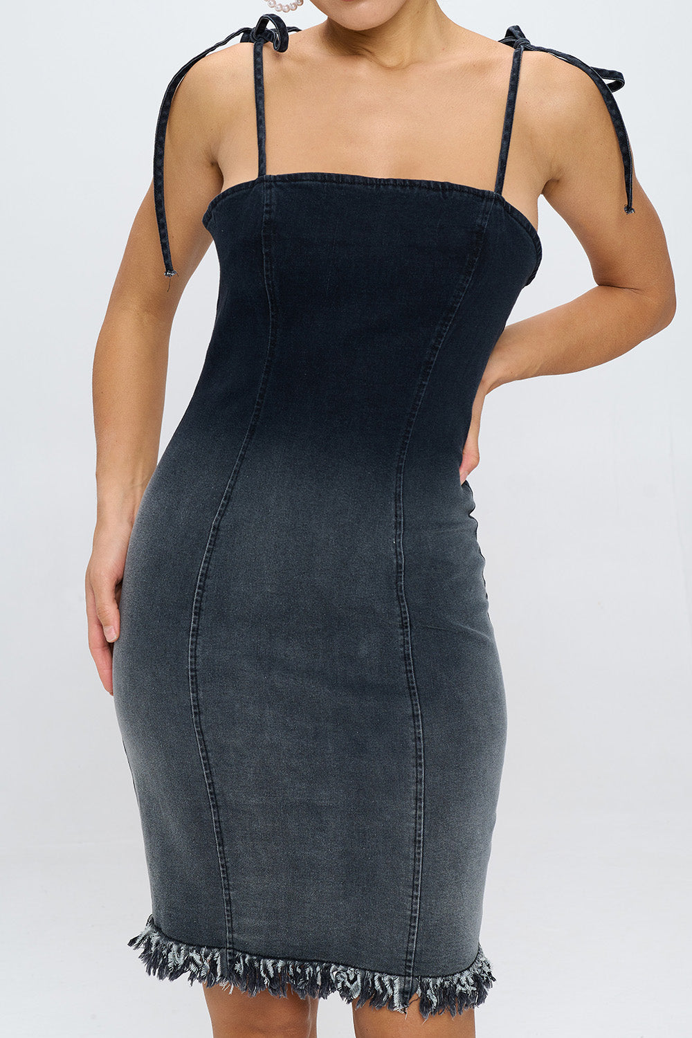 OMBRE FRAYED TIE-STRAP DENIM DRESS