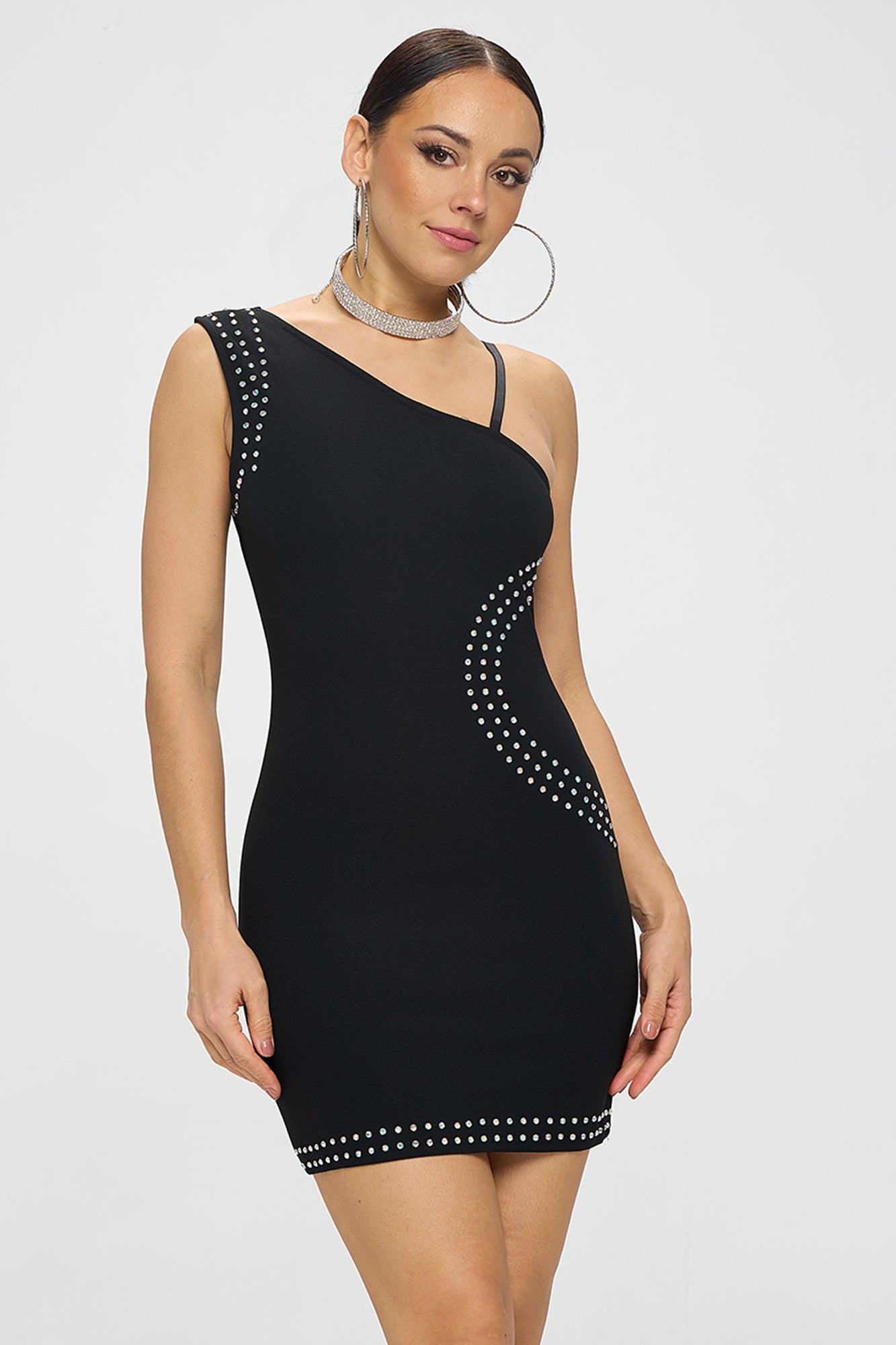 ONE SHOULDER RHINESTONE DETAIL DRESS
