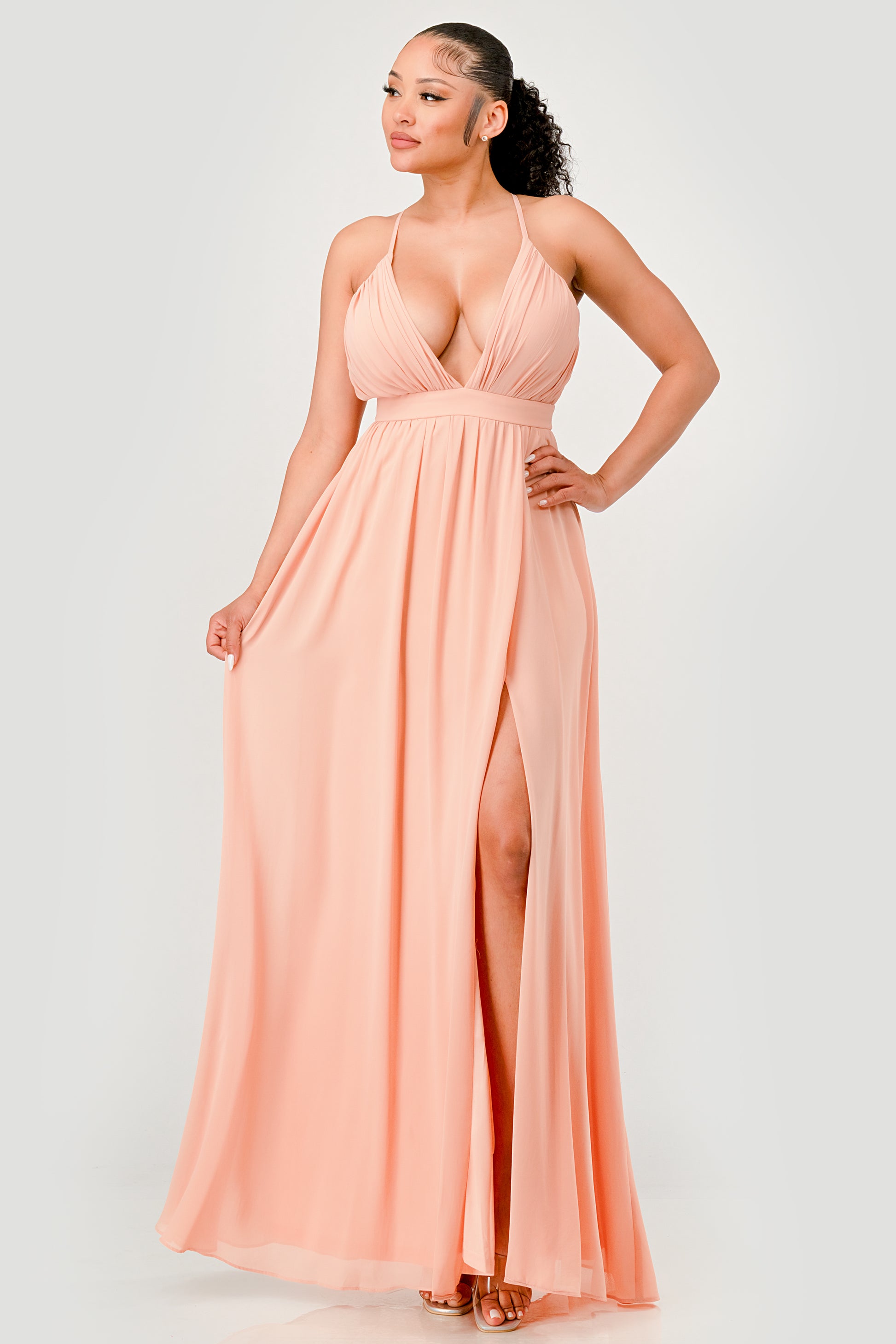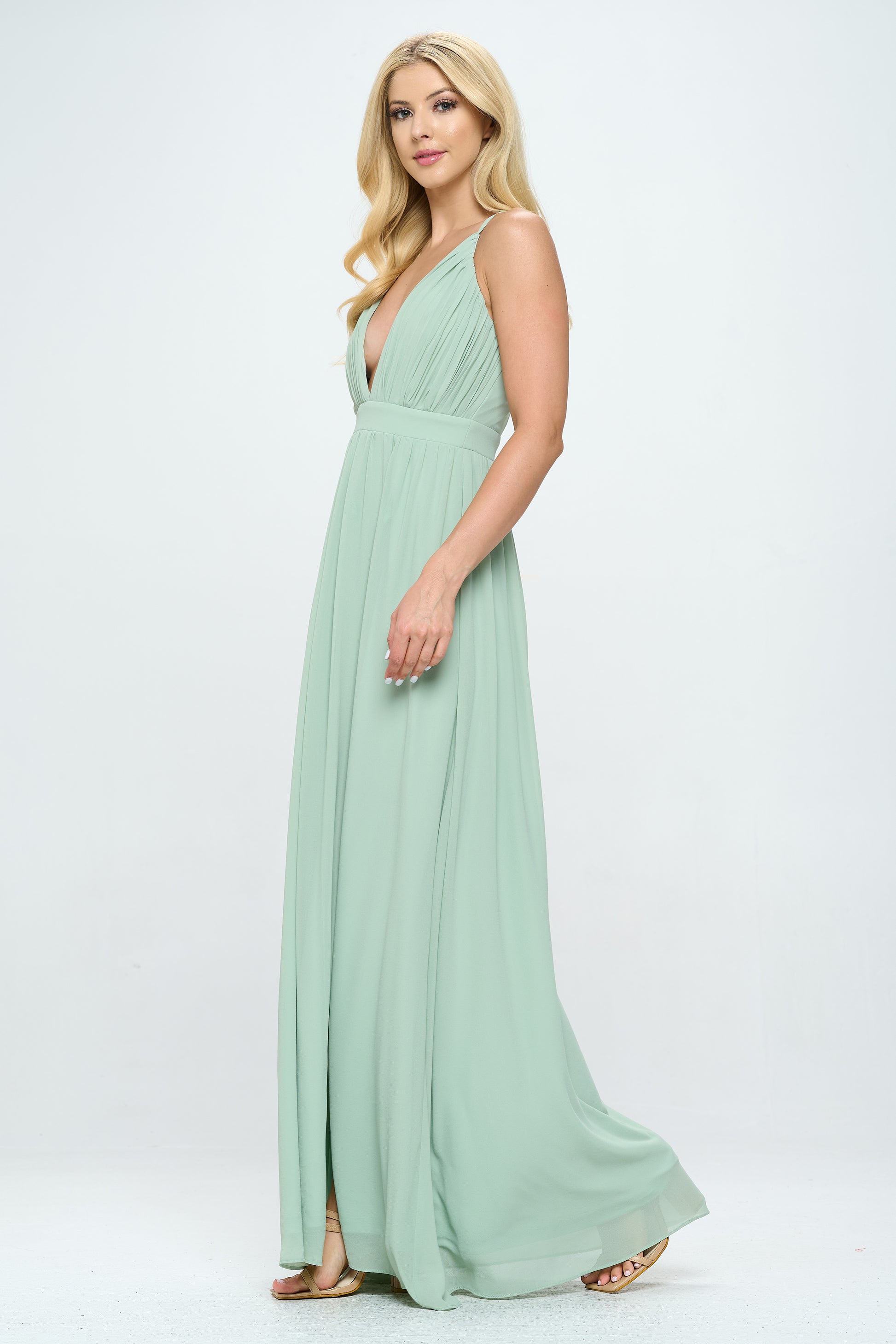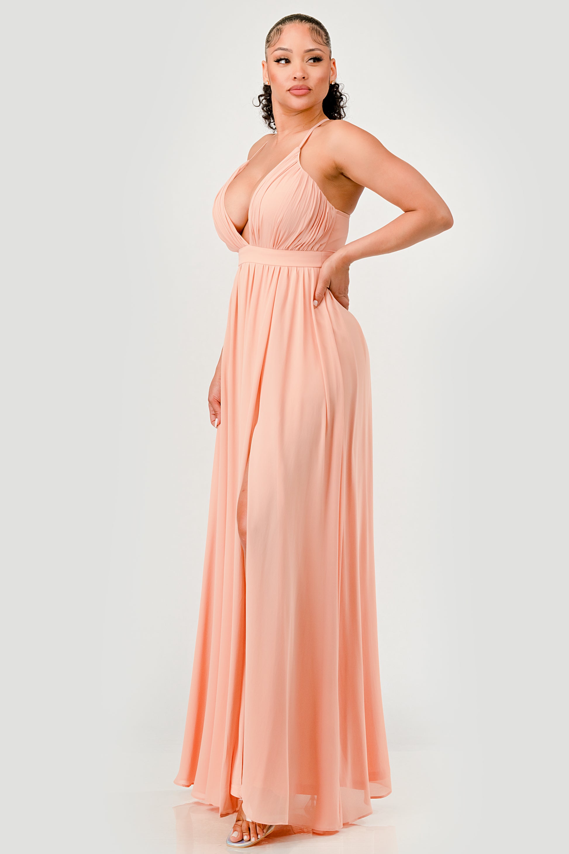PLEATED CHIFFON PLUNGING V NECKLINE MAXI DRESS