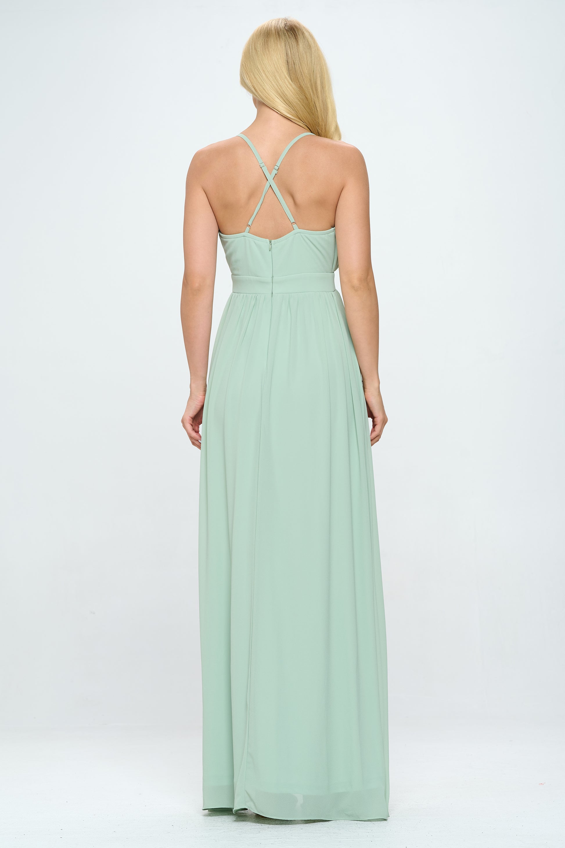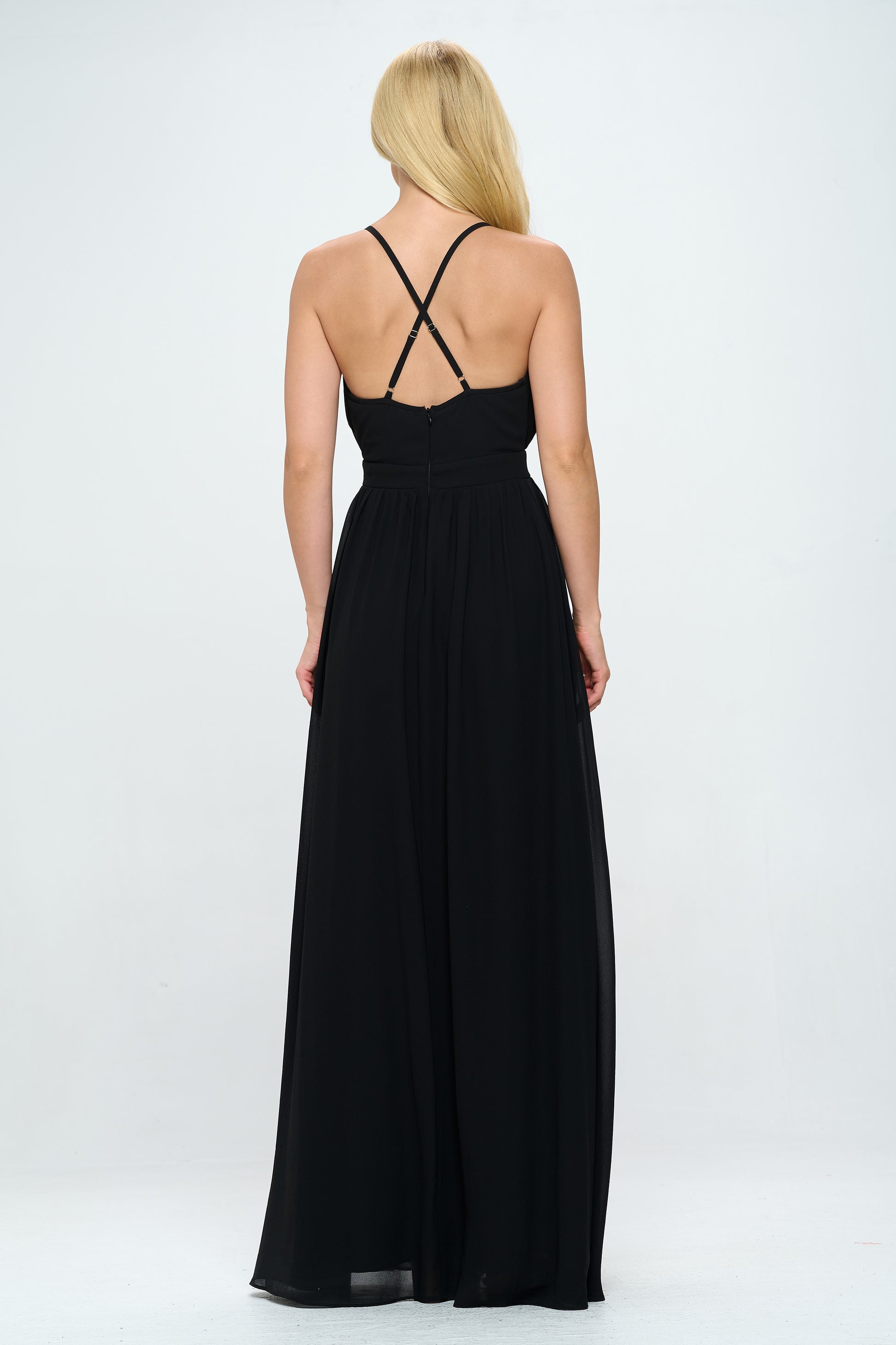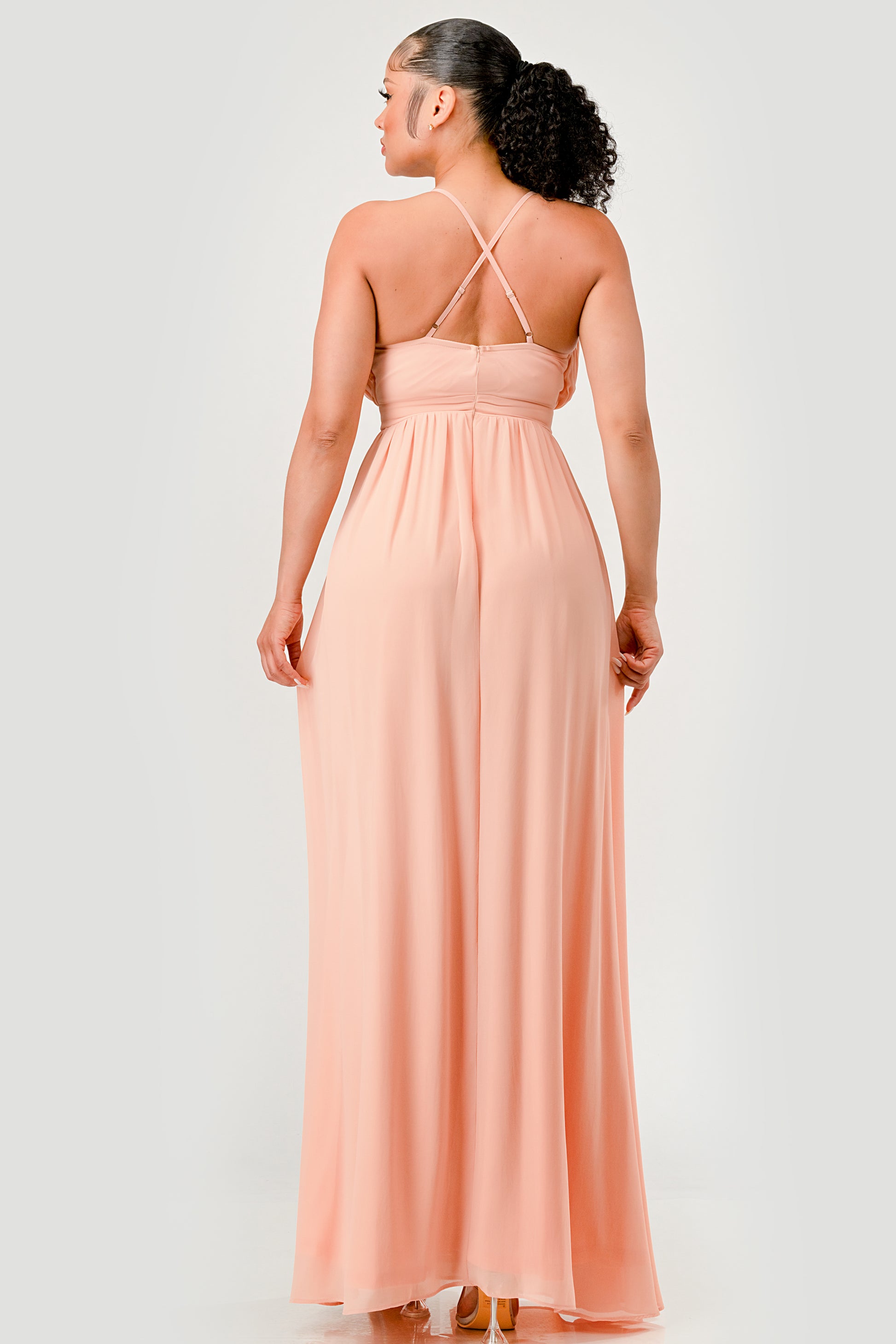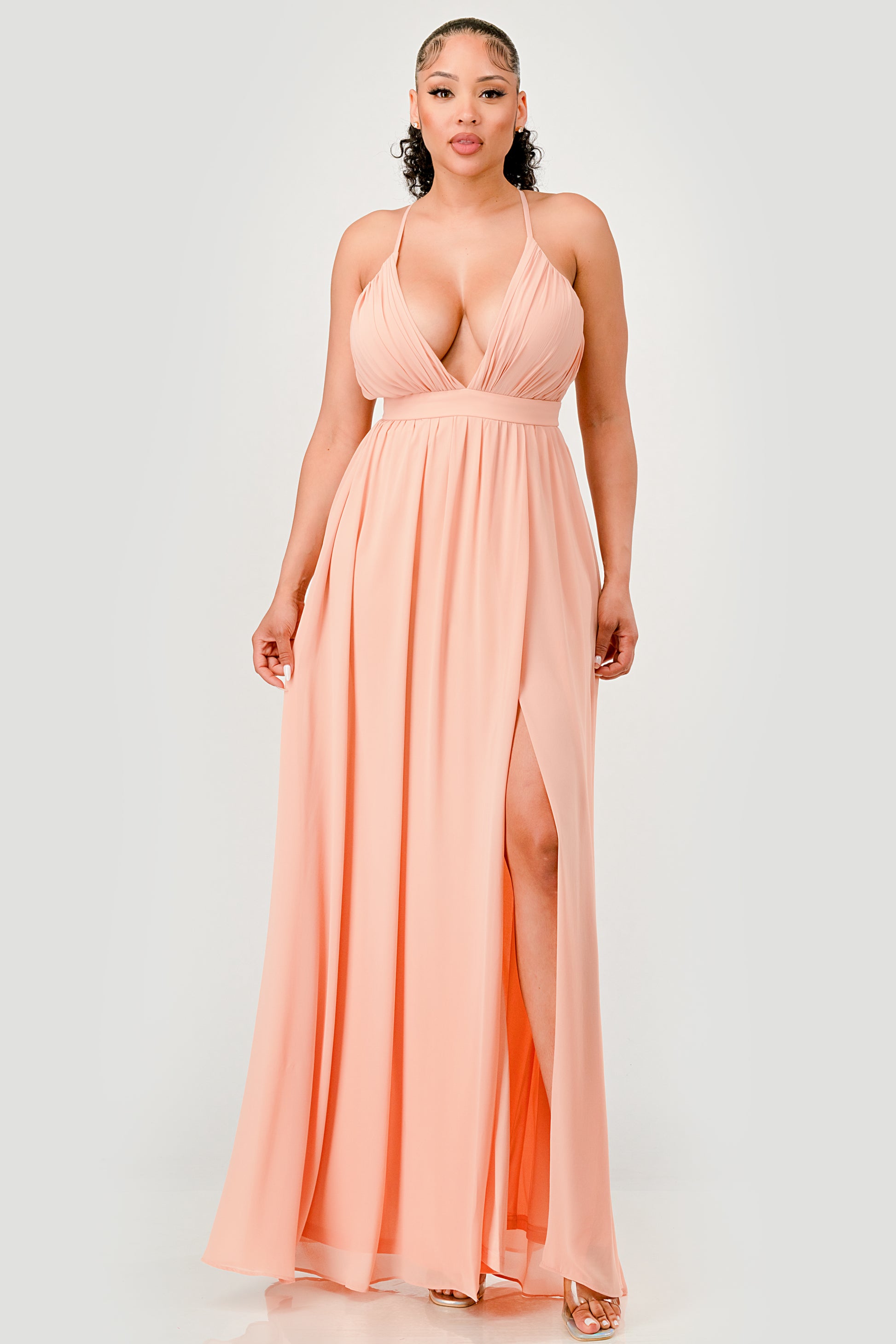 PLEATED CHIFFON PLUNGING V NECKLINE MAXI DRESS