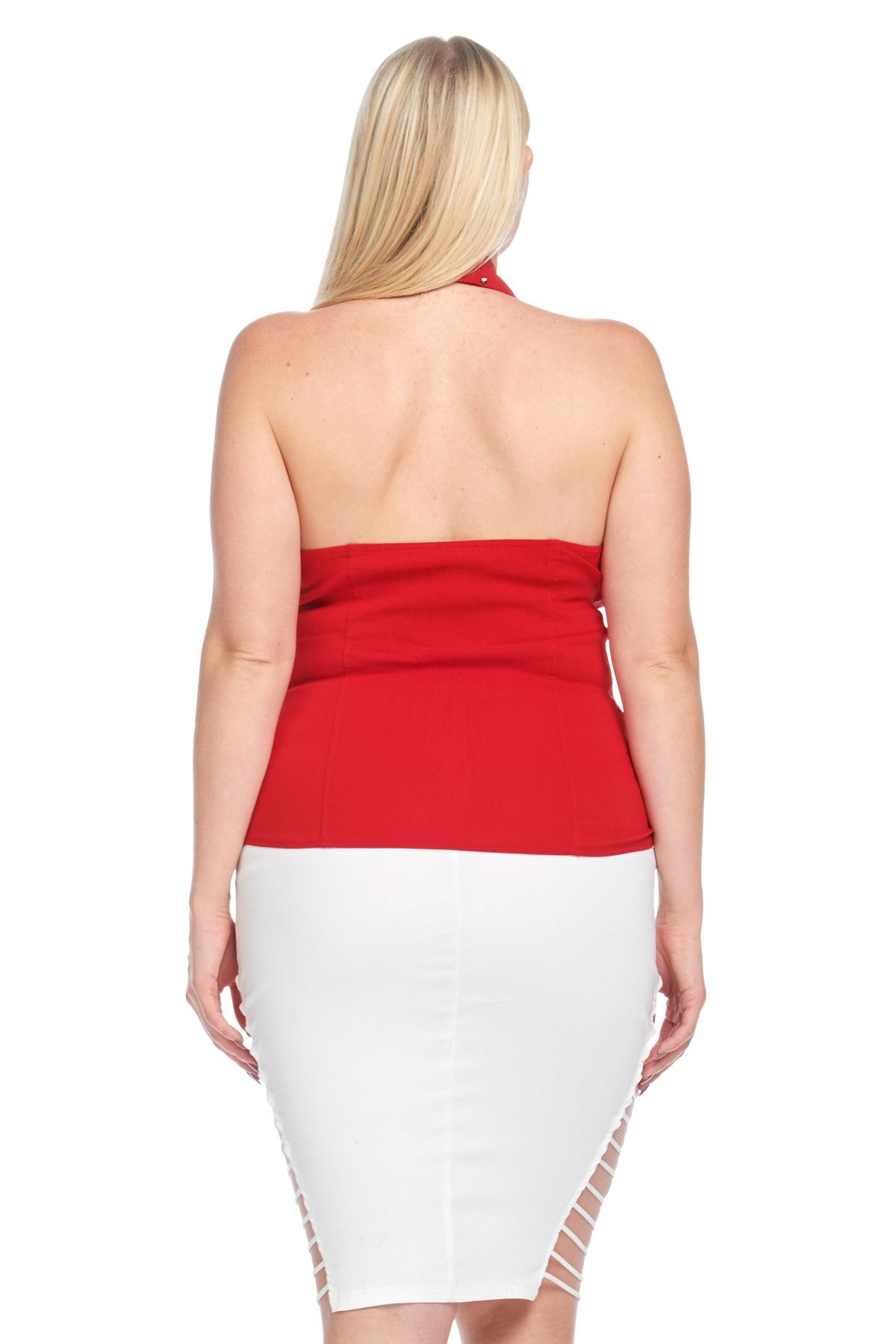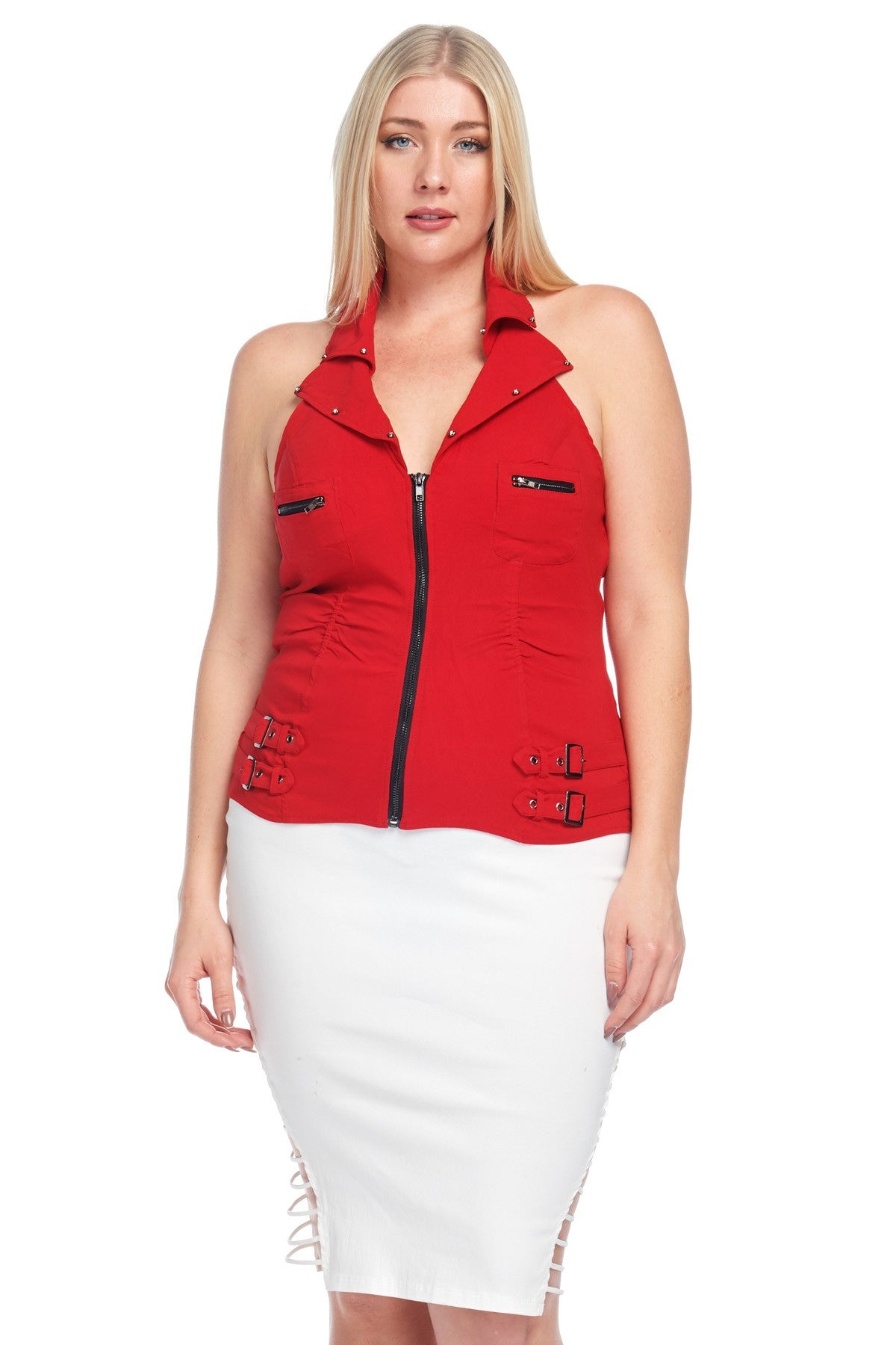 BUCKLE DETAIL ZIPPER FRONT COLLAR HALTER PLUS TANK TOP