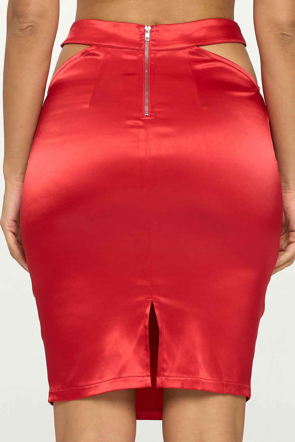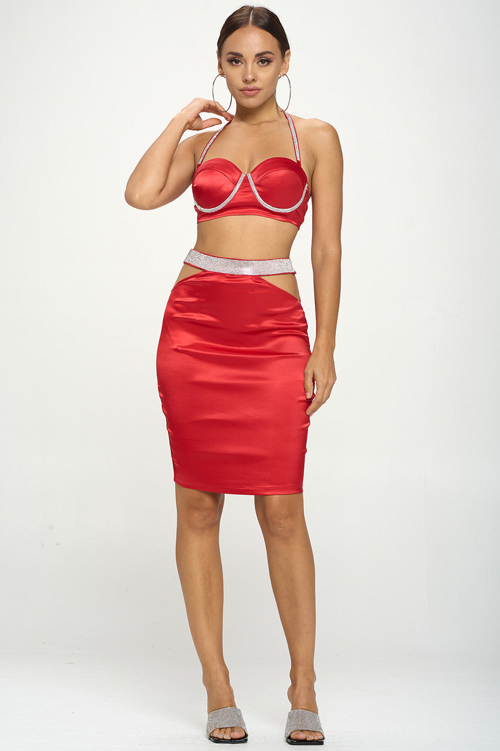 RHINESTONE BEADED WAIST SATIN SKIRT