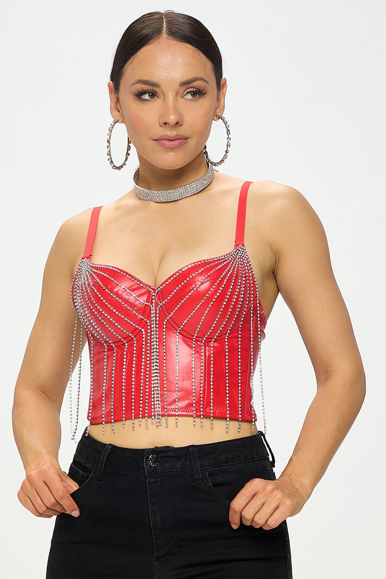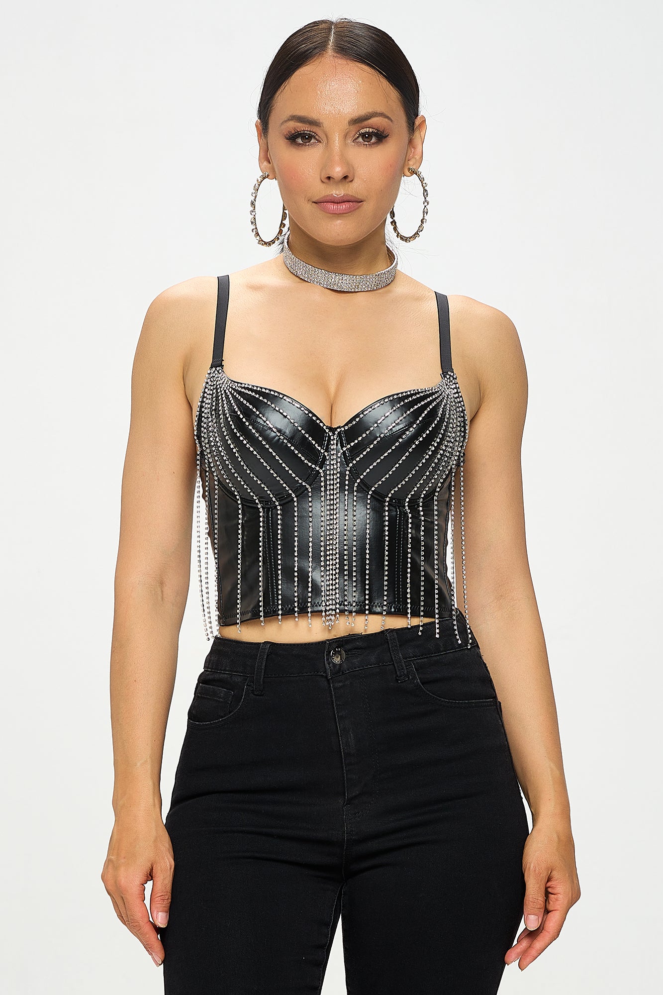 RHINESTONE FRINGE PU CORSET CROP TOP_D7218