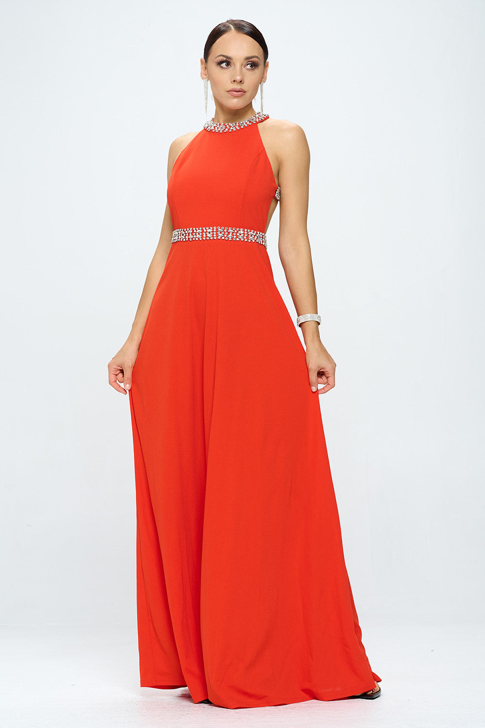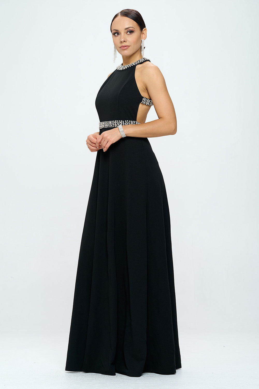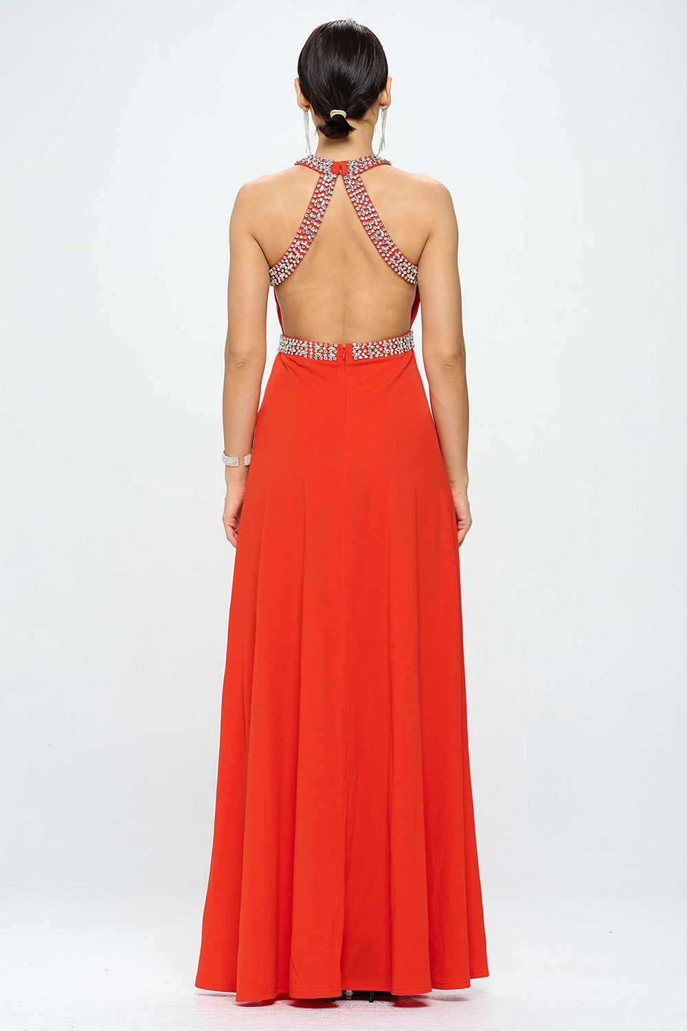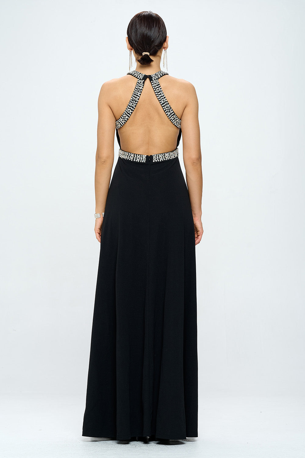 RHINESTONE HALTER NECK OPEN BACK SLIT MAXI DRESS