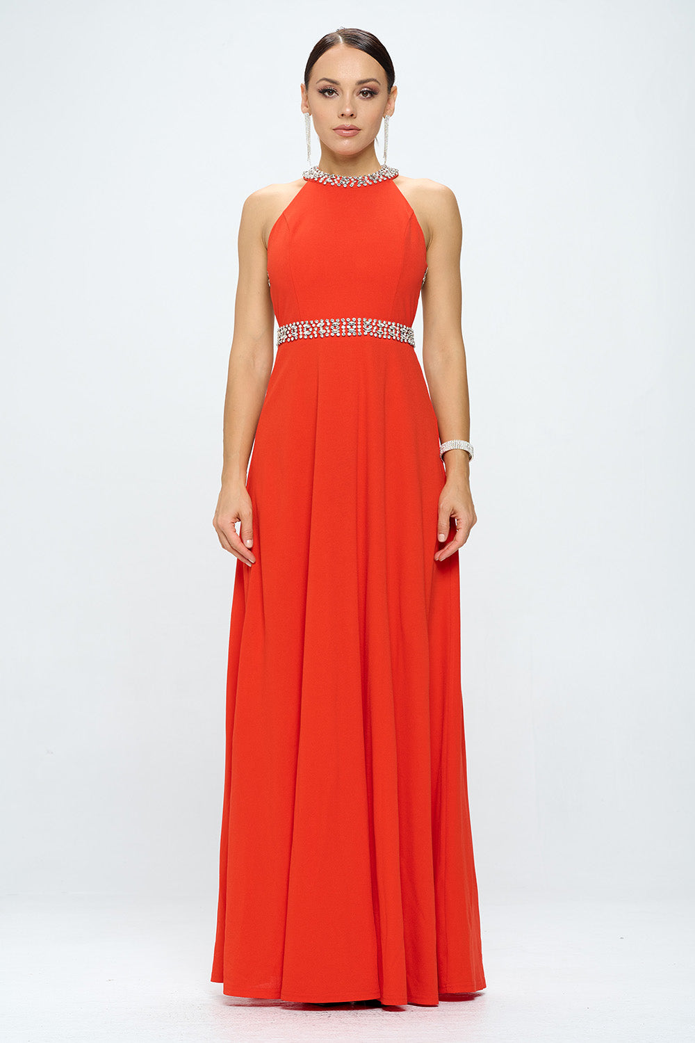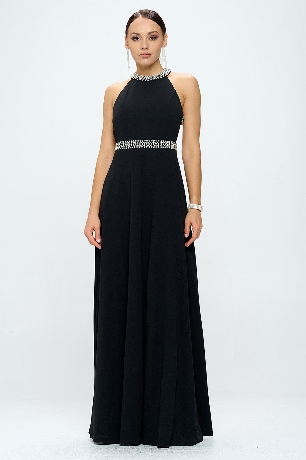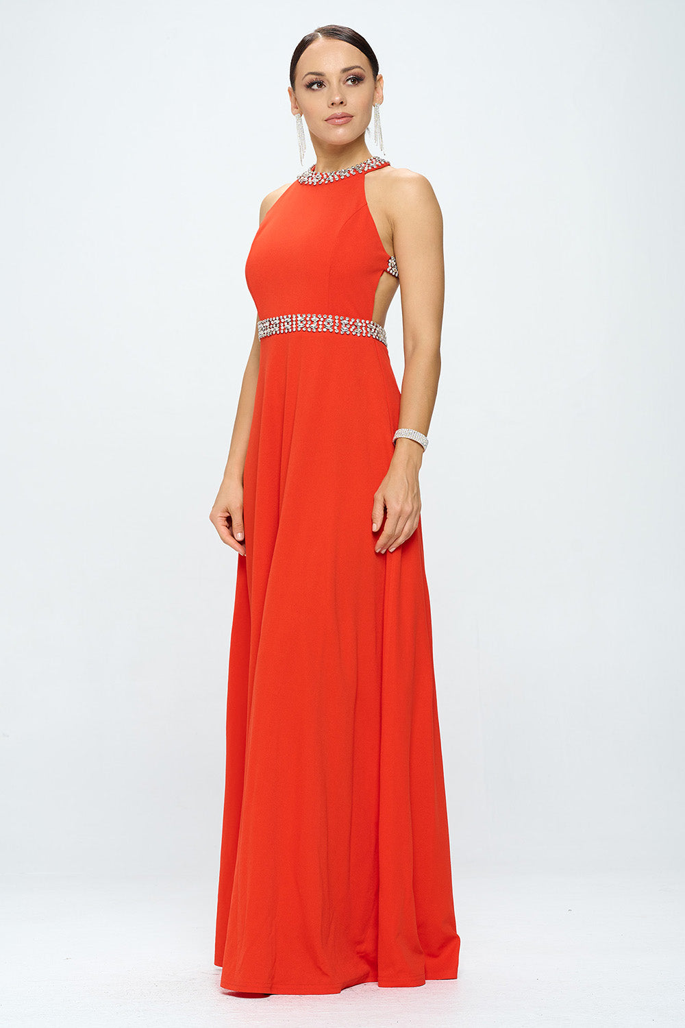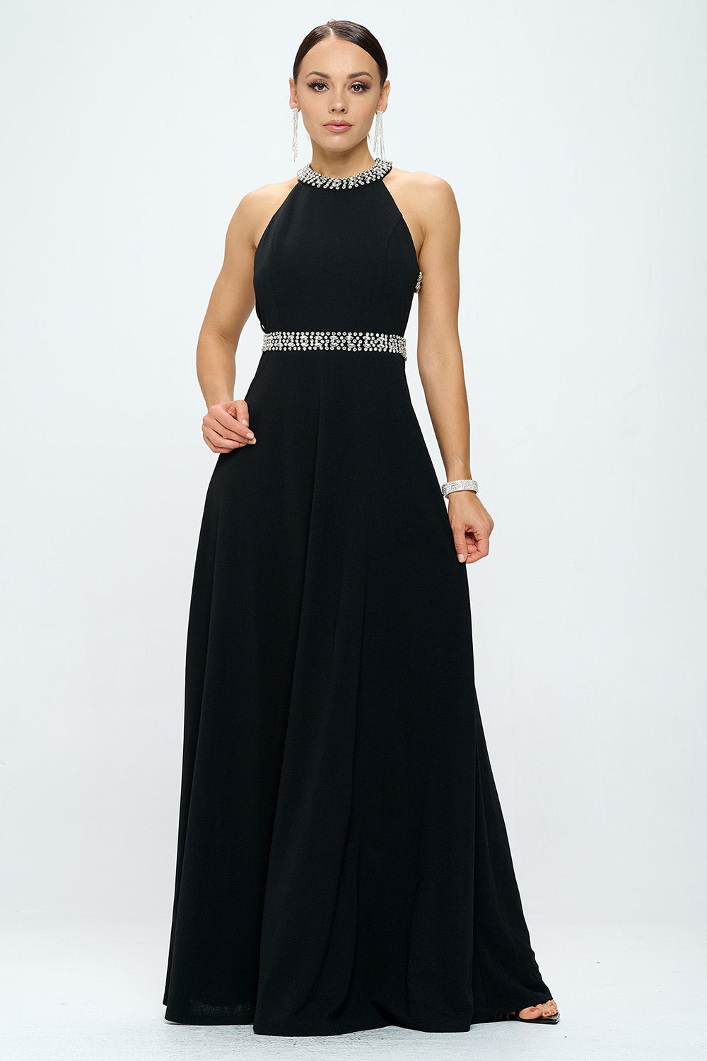 RHINESTONE HALTER NECK OPEN BACK SLIT MAXI DRESS