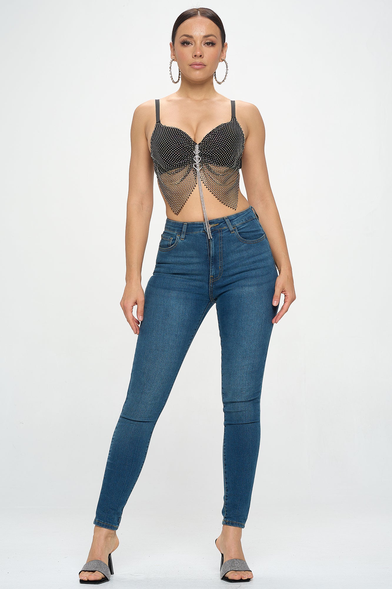 RHINESTONE FISHNET CHAIN HEART PENDANT TASSEL BRA_D7211