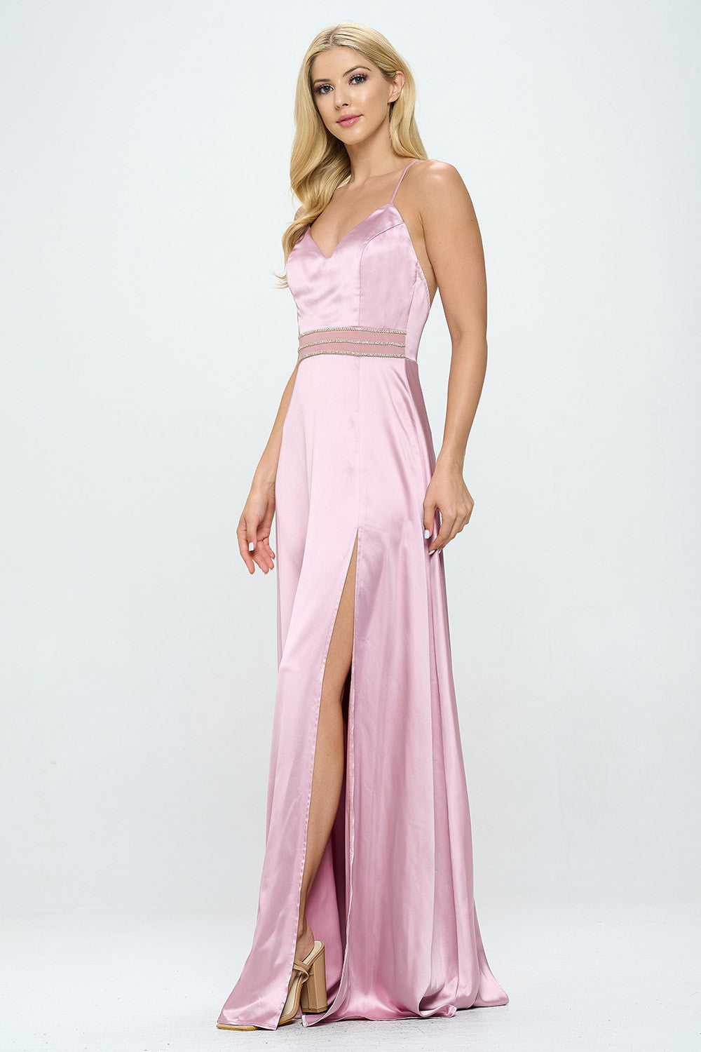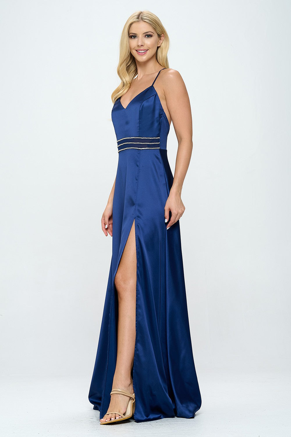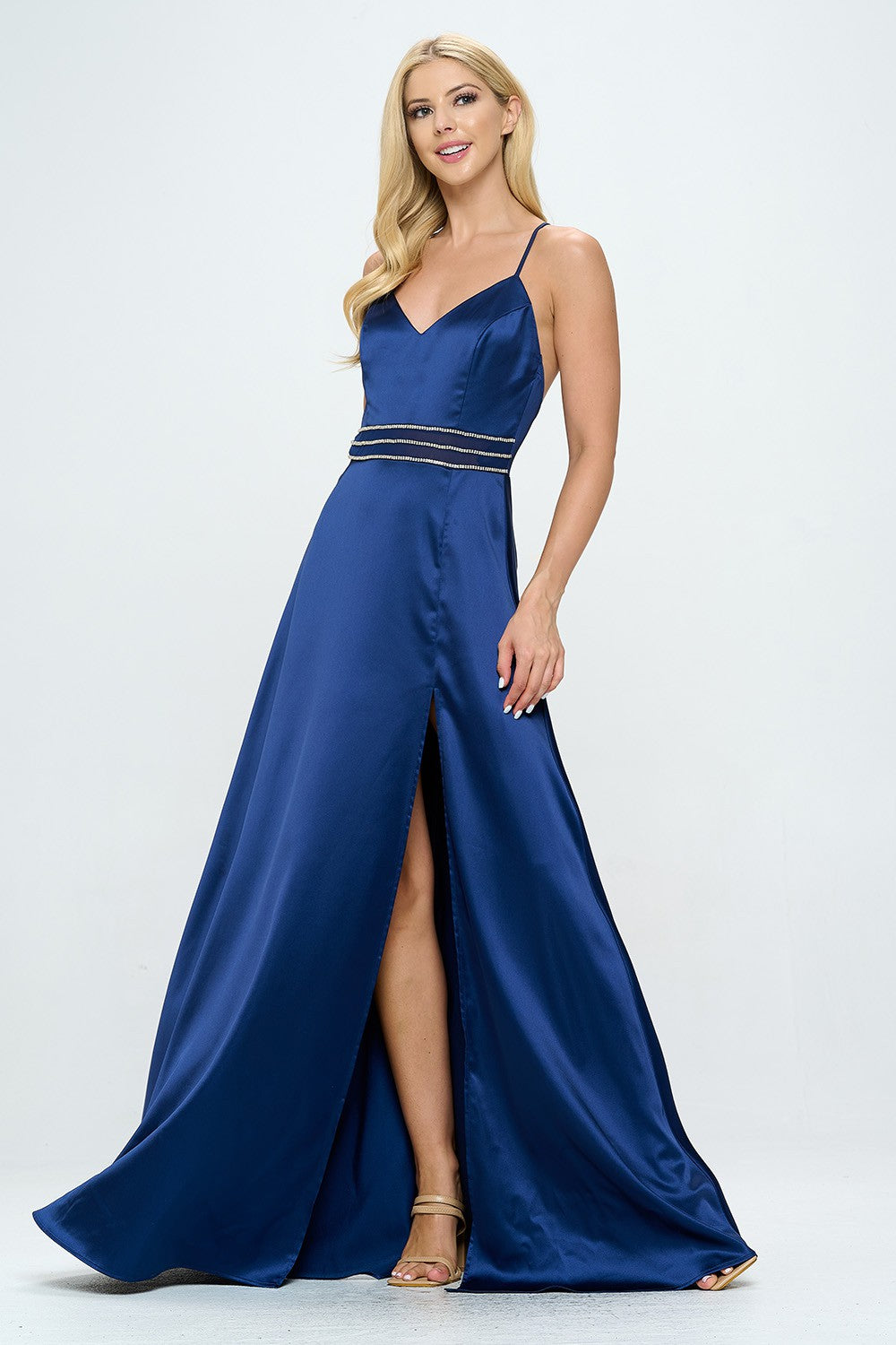 RHINESTONE EMBELLISHED SIDE SLIT FLOOR LENGTH SATIN DRESS