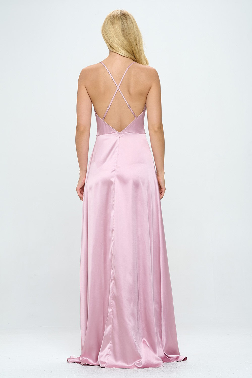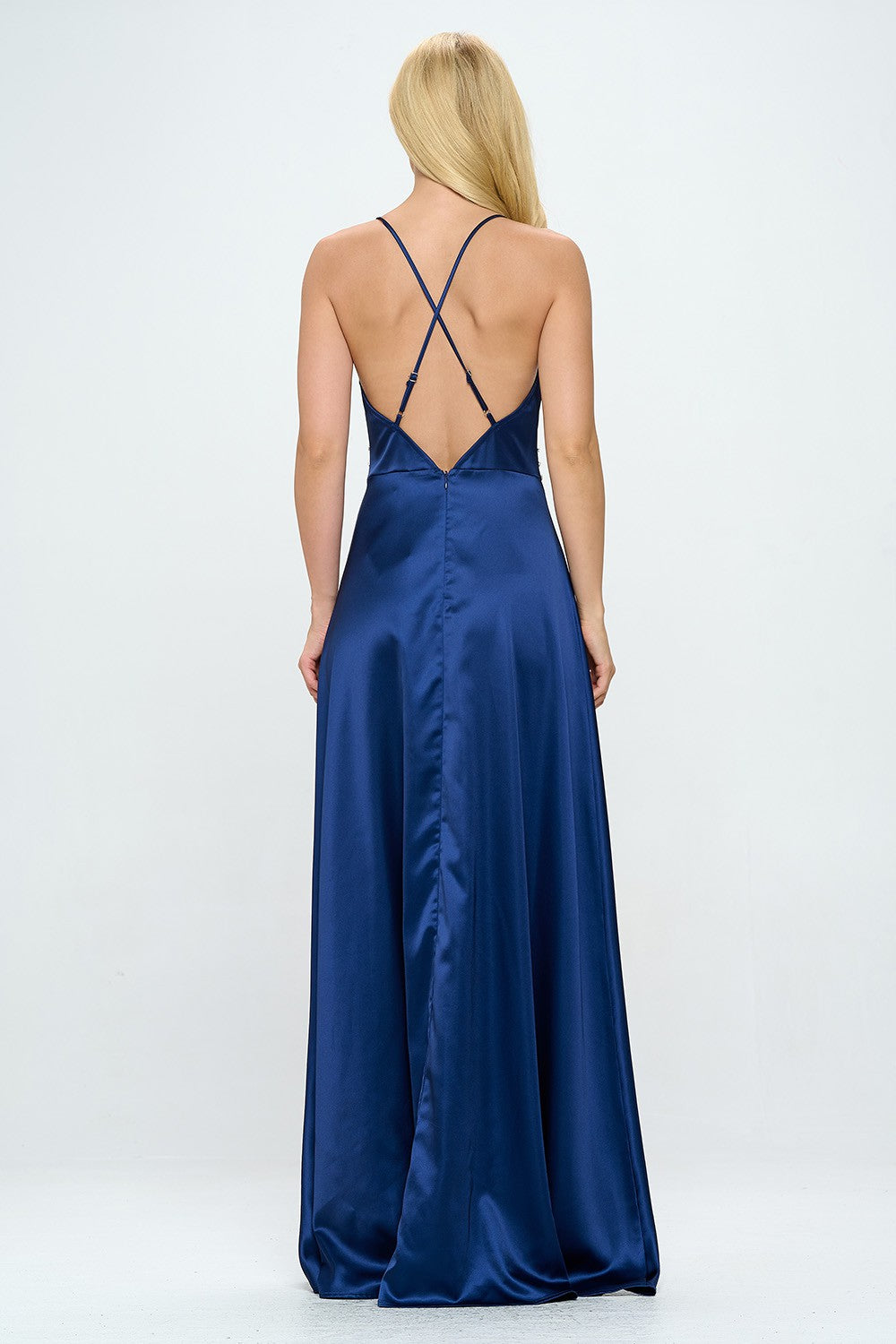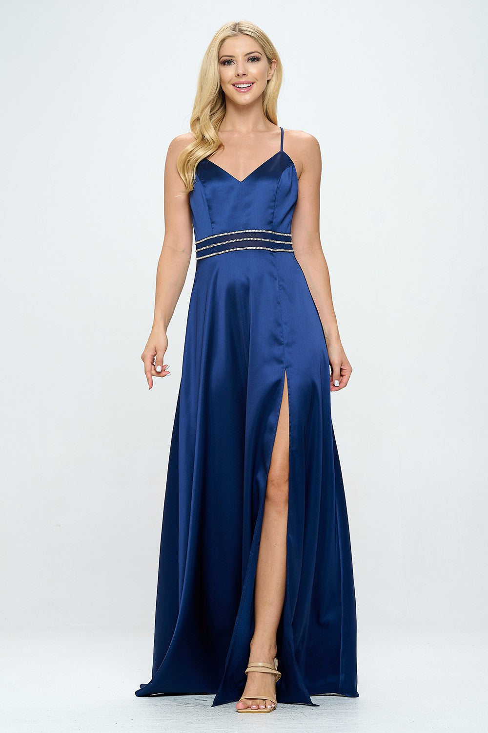 RHINESTONE EMBELLISHED SIDE SLIT FLOOR LENGTH SATIN DRESS